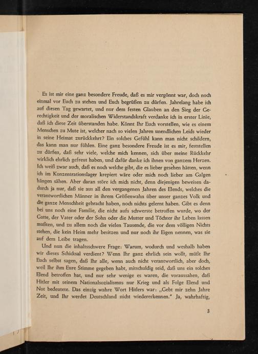 Und nun die inhaltsschwere Frage: Warum, wodurch und weshalb haben wir dieses Schicksal verdient? Wenn Ihr ganz ehrlich sein wollt, müßt Ihr Euch selbst sagen, daß Ihr alle, wenn auch nicht verantwortlich, aber doch, weil Ihr ihm Eure Stimme gegeben habt, mitschuldig seid, daß uns ein solches Elend betroffen hat, und nur sehr wenige es waren, die voraussahen, daß Hitler mit seinem Nationalsozialismus nur Krieg und als Folge Elend und Not bedeutete. Das einzig wahre Wort Hitlers war:„Gebt mir zehn Jahre Zeit, und Ihr werdet Deutschland nicht wiedererkennen.” Ja, wahrhaftig,