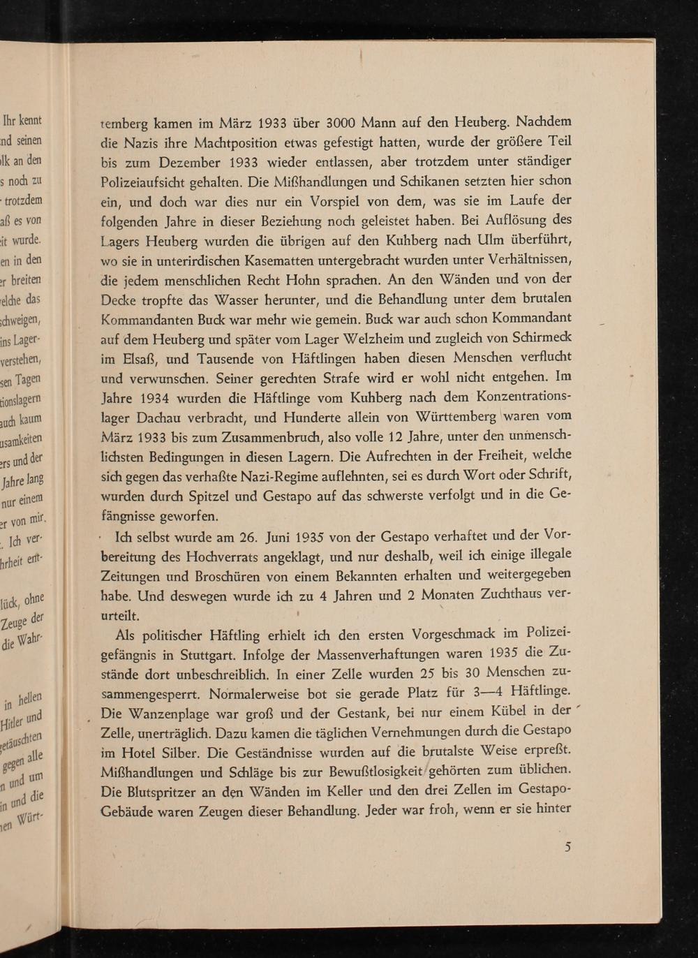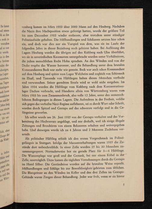 temberg kamen im März 1933 über 3000 Mann auf den Heuberg. Nachdem die Nazis ihre Machtposition etwas gefestigt hatten, wurde der größere Teil bis zum Dezember 1933 wieder entlassen, aber trotzdem unter ständiger Polizeiaufsicht gehalten. Die Mißhandlungen und Schikanen setzten hier schon ein, und doch war dies nur ein Vorspiel von dem, was sie im Laufe der folgenden Jahre in dieser Beziehung noch geleistet haben. Bei Auflösung des Lagers Heuberg wurden die übrigen auf den Kuhberg nach Ulm überführt, wo sie in unterirdischen Kasematten untergebracht wurden unter Verhältnissen, die jedem menschlichen Recht Hohn sprachen. An den Wänden und von der Decke tropfte das Wasser herunter, und die Behandlung unter dem brutalen Kommandanten Buck war mehr wie gemein. Buck war auch schon Kommandant auf dem Heuberg und später vom Lager Welzheim und zugleich von Schirmeck im Elsaß , und Tausende von Häftlingen haben diesen Menschen verflucht und verwunschen. Seiner gerechten Strafe wird er wohl nicht entgehen. Im Jahre 1934 wurden die Häftlinge vom Kuhberg nach dem Konzentrationslager Dachau verbracht, und Hunderte allein von Württemberg waren vom März 1933 bis zum Zusammenbruch, also volle 12 Jahre, unter den unmenschlichsten Bedingungen in diesen Lagern. Die Aufrechten in der Freiheit, welche sich gegen das verhaßte Nazi- Regime auflehnten, sei es durch Wort oder Schrift, wurden durch Spitzel und Gestapo auf das schwerste verfolgt und in die Gefängnisse geworfen.