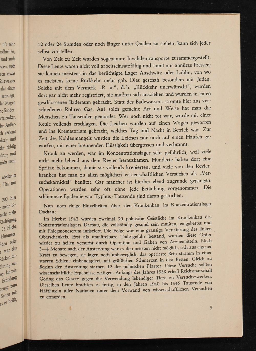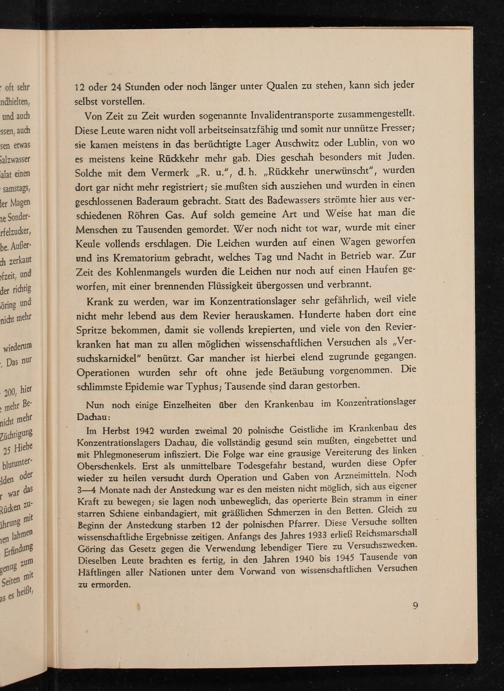 Im Herbst 1942 wurden zweimal 20 polnische Geistliche im Krankenbau des Konzentrationslagers Dachau , die vollständig gesund sein mußten, eingebettet und mit Phlegmoneserum infisziert. Die Folge war eine grausige Vereiterung des linken Oberschenkels. Erst als unmittelbare Todesgefahr bestand, wurden diese Opfer wieder zu heilen versucht durch Operation und Gaben von Arzneimitteln. Noch 3-4 Monate nach der Ansteckung war es den meisten nicht möglich, sich aus eigener Kraft zu bewegen; sie lagen noch unbeweglich, das operierte Bein stramm in einer starren Schiene einbandagiert, mit gräßlichen Schmerzen in den Betten. Gleich zu Beginn der Ansteckung starben 12 der polnischen Pfarrer. Diese Versuche sollten wissenschaftliche Ergebnisse zeitigen. Anfangs des Jahres 1933 erließ Reichsmarschall Göring das Gesetz gegen die Verwendung lebendiger Tiere zu Versuchszwecken. Dieselben Leute brachten es fertig, in den Jahren 1940 bis 1945 Tausende von Häftlingen aller Nationen unter dem Vorwand von wissenschaftlichen Versuchen zu ermorden.