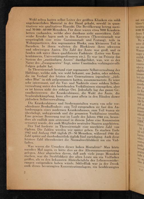 In Theresienstadt bestand eine sogenannte Selbstverwaltung der Häftlinge, welche sich, wie wohl bekannt, aus Juden, oder solchen, die im Verlauf der letzten drei Generationen irgendwie ,, jüdisches Blut" in sich aufgenommen hatten, zusammensetzte. Es wäre sehr interessant, auf die Vor- und Nachteile einer solchen Selbstverwaltung unter den bestehenden Verhältnissen einzugehen, aber es ist hierzu nicht der richtige Ort. Jedenfalls lag das ganze Gesundheitswesen: die Krankenhäuser, die Wahl der Ärzte, die Seuchenbekämpfung, kurz alles ganz allein in den Händen dieser jüdischen Selbstverwaltung.