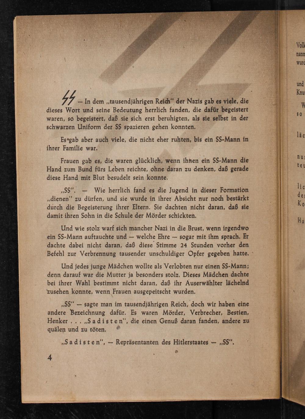 SS — In dem„tausendjährigen Reich“ der Nazis gab es viele, die dieses Wort und seine Bedeutung herrlich fanden, die dafür begeistert waren, so begeistert, daß sie sich erst beruhigten, als sie selbst in der schwarzen Uniform der$$ spazieren gehen konnten. Es®gab aber auch viele, die nicht eher ruhten, bis ein SS-Mann in ihrer Familie war, Frauen gab es, die waren glücklich, wenn ihnen ein SS-Mann die Hand zum Bund fürs Leben reichte, ohne daran zu denken, daß gerade diese Hand mit Blut besudelt sein konnte. „SS“,— Wie herrlich fand es die Jugend in dieser Formation „dienen‘ zu dürfen, und sie. wurde in ihrer Absicht nur noch bestärkt durch die Begeisterung ihrer Eltern. Sie dachten nicht daran, daß sie damit ihren Sohn in die Schule der Mörder schickten. Und wie stolz warf sich mancher Nazi in die Brust, wenn irgendwo ein SS-Mann auftauchte und— welche Ehre— sogar mit ihm sprach. Er dachte dabei nicht daran, daß diese Stimme 24 Stunden vorher den Befehl zur Verbrennung tausender unschuldiger Opfer gegeben hatte.° Und jedes junge Mädchen wollte als Verlobten nur einen$$-Mann; denn darauf war die Mutter ja besonders stolz, Dieses Mädchen dachte bei ihrer Wahl bestimmt nicht daran, daß ihr Auserwählter lächelnd zusehen konnte, wenn ‚Frauen ausgepeitscht wurden. „SS“— sagte man im tausendjährigen Reich, doch wir haben eine andere Bezeichnung dafür. Es waren Mörder, Verbrecher, Bestien, Henker...„Sadisten‘, die einen Genuß daran fanden, andere zu quälen und zu töten.* „Sadisten‘,— Repräsentanten des Hitlerstaates—„SS“.