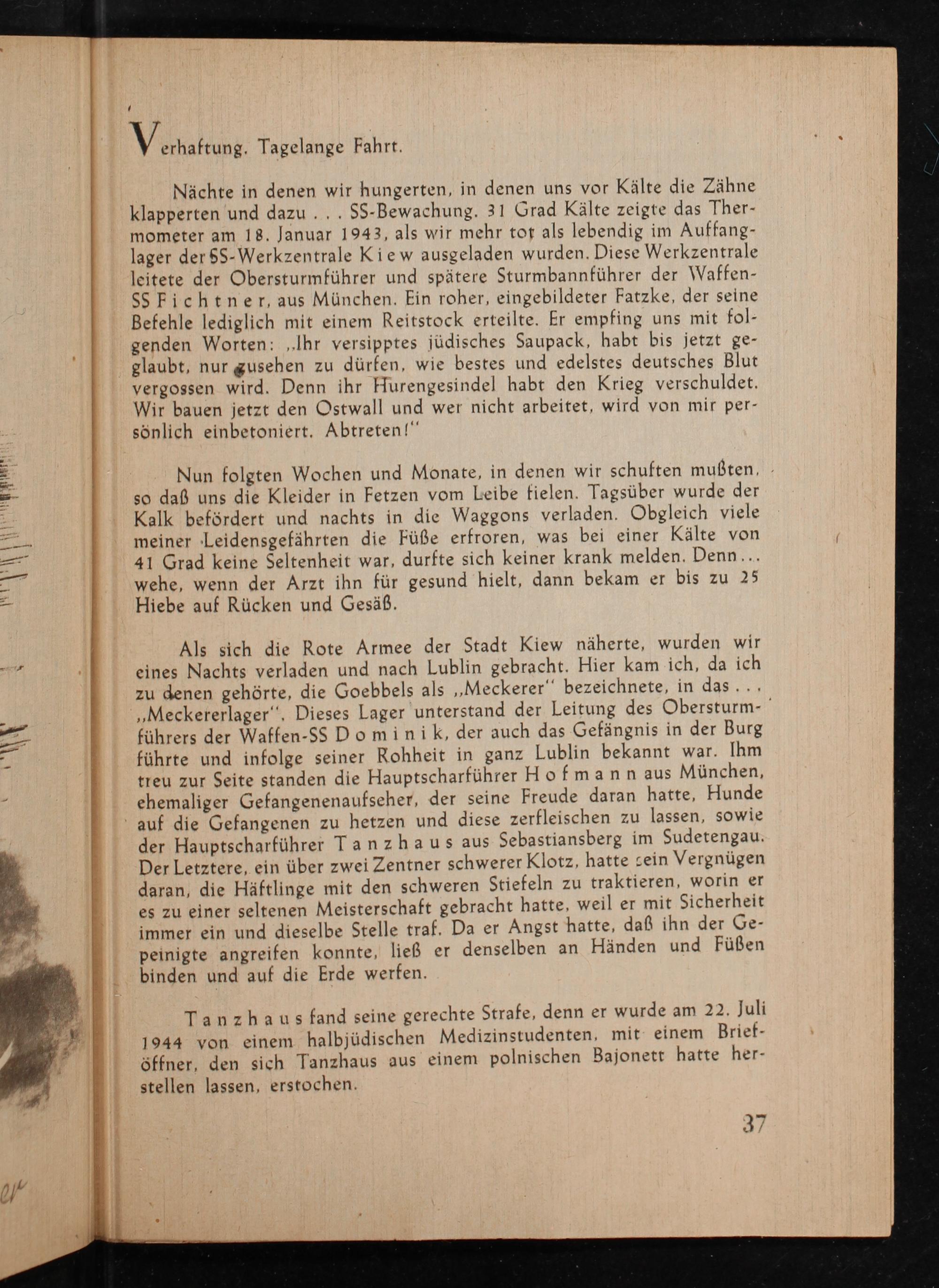 Als sich die Rote Armee der Stadt Kiew näherte, wurden wir eines Nachts verladen und nach Lublin gebracht. Hier kam ich, da ich zu denen gehörte, die Goebbels als ,, Meckerer" bezeichnete, in das... ,, Meckererlager". Dieses Lager unterstand der Leitung des Obersturmführers der Waffen- SS Dominik, der auch das Gefängnis in der Burg führte und infolge seiner Rohheit in ganz Lublin bekannt war. Ihm treu zur Seite standen die Hauptscharführer Hofmann aus München , ehemaliger Gefangenenaufseher, der seine Freude daran hatte, Hunde auf die Gefangenen zu hetzen und diese zerfleischen zu lassen, sowie der Hauptscharführer Tanzhaus aus Sebastiansberg im Sudetengau. Der Letztere, ein über zwei Zentner schwerer Klotz, hatte sein Vergnügen daran, die Häftlinge mit den schweren Stiefeln zu traktieren, worin er es zu einer seltenen Meisterschaft gebracht hatte, weil er mit Sicherheit immer ein und dieselbe Stelle traf. Da er Angst hatte, daß ihn der Gepeinigte angreifen konnte, ließ er denselben an Händen und Füßen binden und auf die Erde werfen.