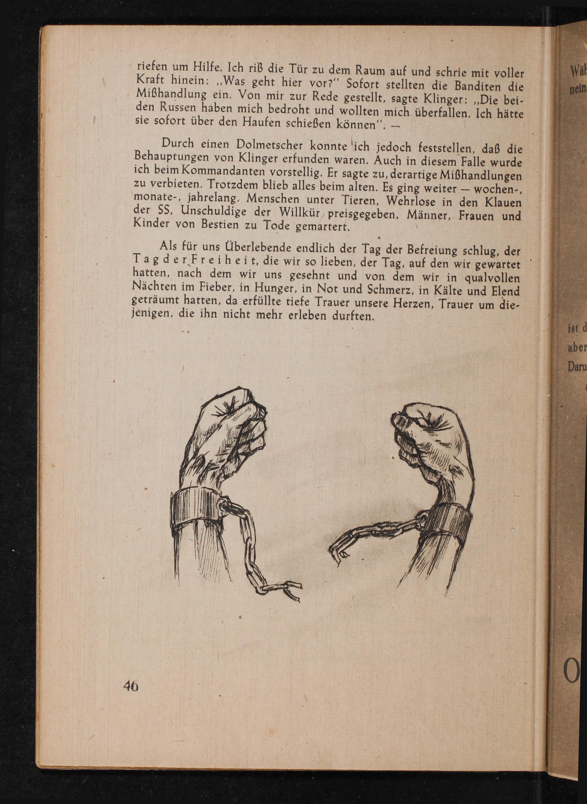 riefen um Hilfe. Ich riß die Tür zu dem Raum auf und schrie mit voller Kraft hinein;„Was geht hier vor?“ Sofort stellten die Banditen die Mißhandlung ein. Von mir zur Rede gestellt, sagte Klinger:„Die bei- den Russen haben mich bedroht und wollten mich überfallen. Ich hätte sie sofort über den Haufen schießen können‘,—