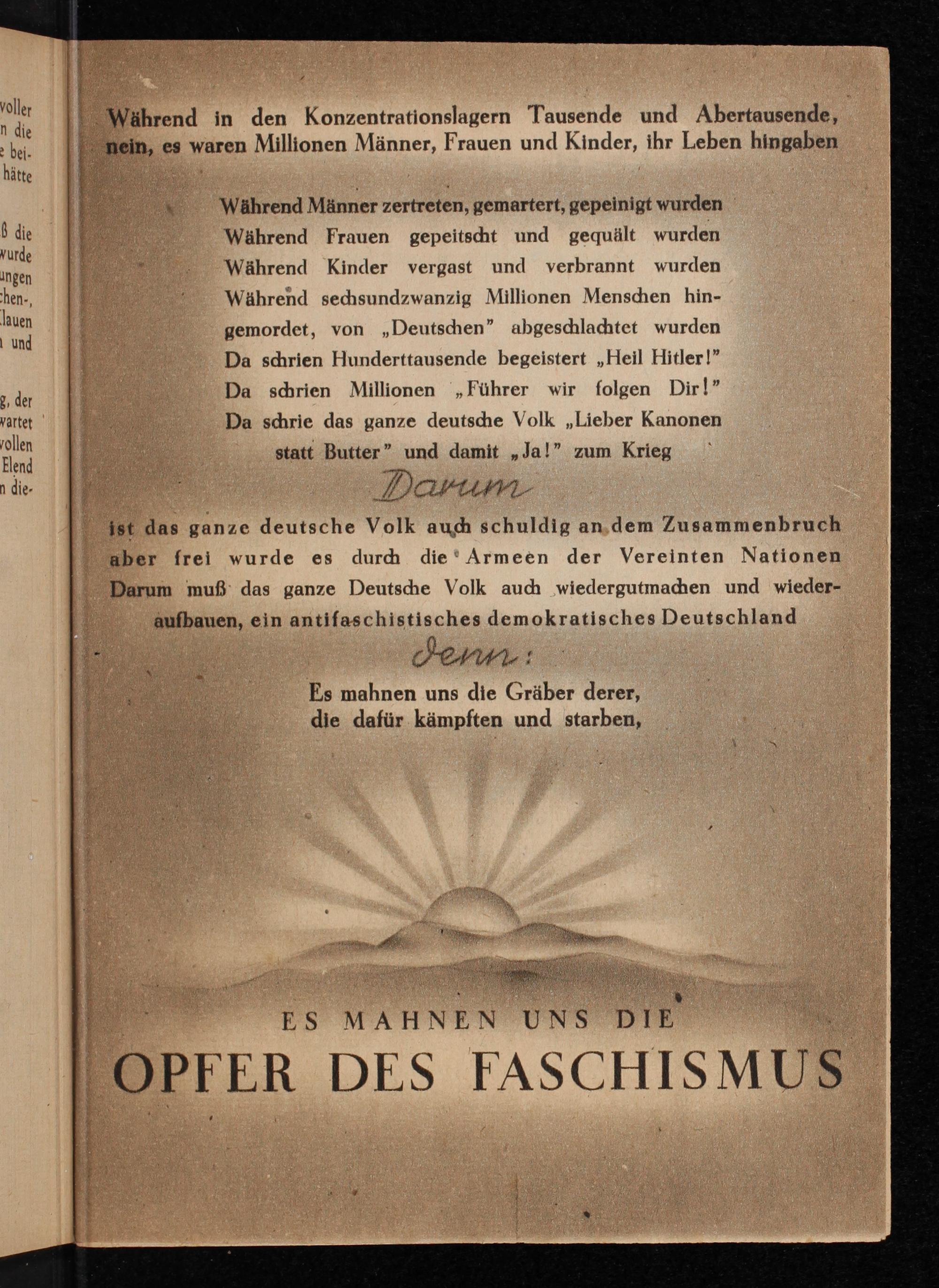 ist das ganze deutsche Volk auch schuldig an dem Zusammenbruch aber frei wurde es durch die Armeen der Vereinten Nationen Darum muß das ganze Deutsche Volk auch wiedergutmachen und wiederaufbauen, ein antifaschistisches demokratisches Deutschland