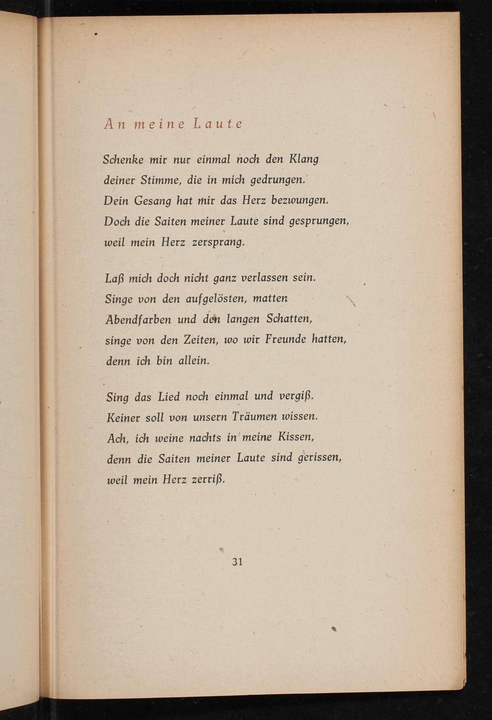 Dein Gesang hat mir das Herz bezwungen. Doch die Saiten meiner Laute sind gesprungen,