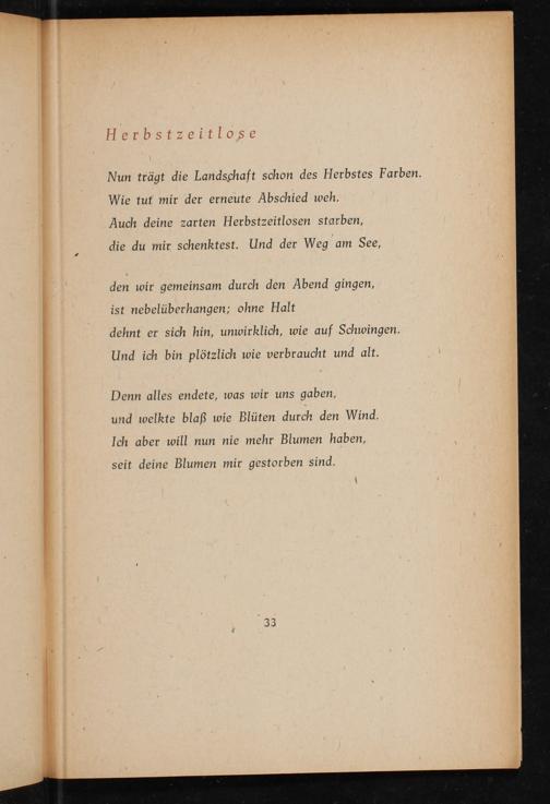 Denn alles endete, was wir uns gaben, und welkte blaß wie Blüten durch den Wind. Ich aber will nun nie mehr Blumen haben,