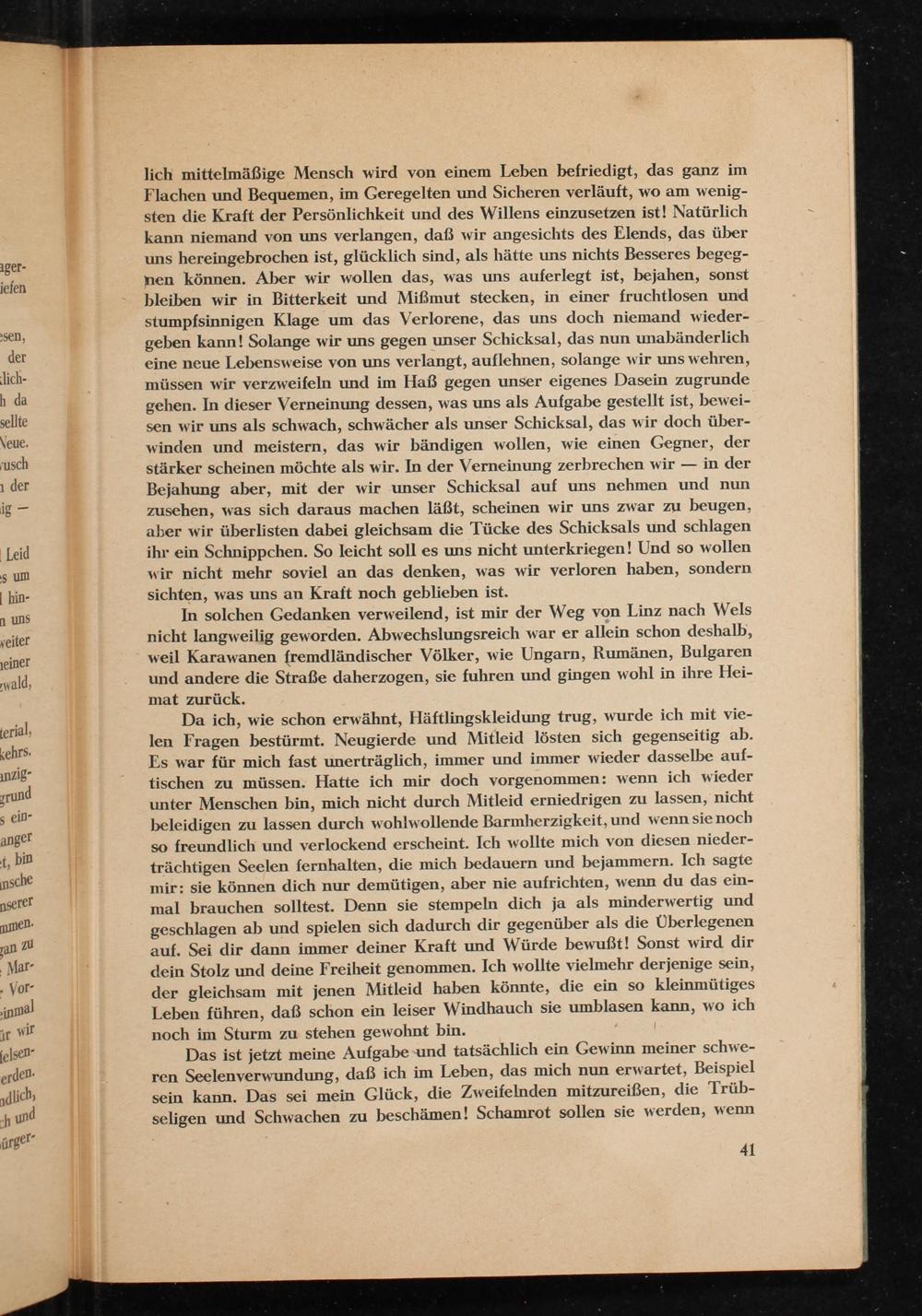 Da ich, wie schon erwähnt, Häftlingskleidung trug, wurde ich mit vielen Fragen bestürmt. Neugierde und Mitleid lösten sich gegenseitig ab. Es war für mich fast unerträglich, immer und immer wieder dasselbe auftischen zu müssen. Hatte ich mir doch vorgenommen: wenn ich wieder unter Menschen bin, mich nicht durch Mitleid erniedrigen zu lassen, nicht beleidigen zu lassen durch wohlwollende Barmherzigkeit, und wenn sie noch so freundlich und verlockend erscheint. Ich wollte mich von diesen niederträchtigen Seelen fernhalten, die mich bedauern und bejammern. Ich sagte mir: sie können dich nur demütigen, aber nie aufrichten, wenn du das einmal brauchen solltest. Denn sie stempeln dich ja als minderwertig und geschlagen ab und spielen sich dadurch dir gegenüber als die Überlegenen auf. Sei dir dann immer deiner Kraft und Würde bewußt! Sonst wird dir dein Stolz und deine Freiheit genommen. Ich wollte vielmehr derjenige sein, der gleichsam mit jenen Mitleid haben könnte, die ein so kleinmütiges Leben führen, daß schon ein leiser Windhauch sie umblasen kann, wo ich noch im Sturm zu stehen gewohnt bin.