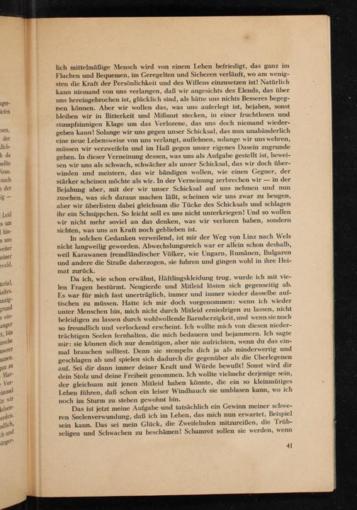lich mittelmäßige Mensch wird von einem Leben befriedigt, das ganz im Flachen und Bequemen, im Geregelten und Sicheren verläuft, wo am wenigsten die Kraft der Persönlichkeit und des Willens einzusetzen ist! Natürlich kann niemand von uns verlangen, daß wir angesichts des Elends, das über uns hereingebrochen ist, glücklich sind, als hätte uns nichts Besseres begegnen können. Aber wir wollen das, was uns auferlegt ist, bejahen, sonst bleiben wir in Bitterkeit und Mißmut stecken, in einer fruchtlosen und stumpfsinnigen Klage um das Verlorene, das uns doch niemand wiedergeben kann! Solange wir uns gegen unser Schicksal, das nun unabänderlich eine neue Lebensweise von uns verlangt, auflehnen, solange wir uns wehren, müssen wir verzweifeln und im Haß gegen unser eigenes Dasein zugrunde gehen. In dieser Verneinung dessen, was uns als Aufgabe gestellt ist, beweisen wir uns als schwach, schwächer als unser Schicksal, das wir doch überwinden und meistern, das wir bändigen wollen, wie einen Gegner, der in der stärker scheinen möchte als wir. In der Verneinung zerbrechen wir Bejahung aber, mit der wir unser Schicksal auf uns nehmen und nun zusehen, was sich daraus machen läßt, scheinen wir uns zwar zu beugen, aber wir überlisten dabei gleichsam die Tücke des Schicksals und schlagen ihr ein Schnippchen. So leicht soll es uns nicht unterkriegen! Und so wollen wir nicht mehr soviel an das denken, was wir verloren haben, sondern sichten, was uns an Kraft noch geblieben ist.