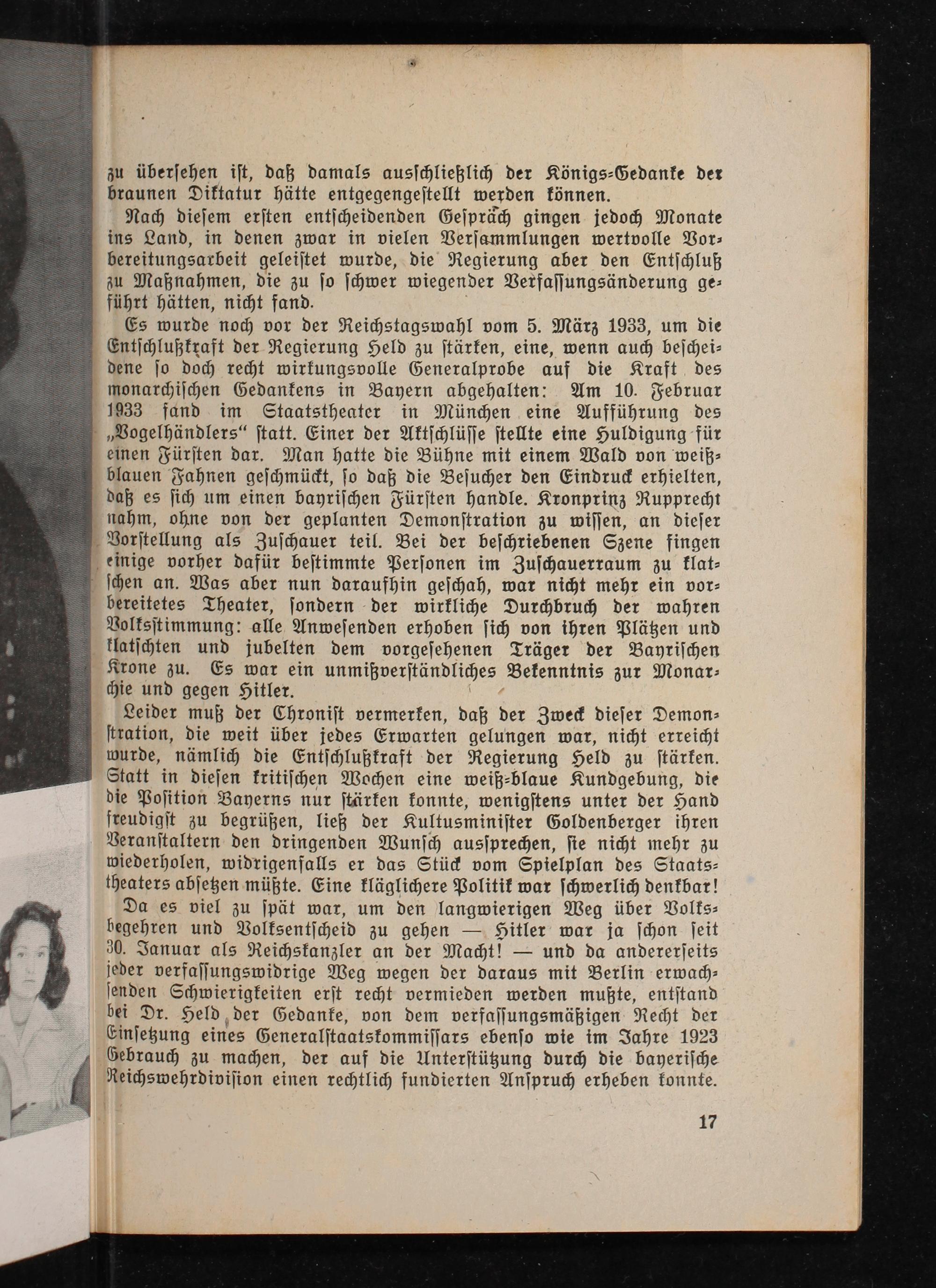 Leider muß der Chronist vermerken, daß der Zweck dieser Demonstration, die weit über jedes Erwarten gelungen war, nicht erreicht wurde, nämlich die Entschlußkraft der Regierung Held zu stärken. Statt in diesen kritischen Wochen eine weiß- blaue Kundgebung, die die Position Bayerns nur stärken konnte, wenigstens unter der Hand freudigst zu begrüßen, ließ der Kultusminister Goldenberger ihren Veranstaltern den dringenden Wunsch aussprechen, sie nicht mehr zu wiederholen, widrigenfalls er das Stück vom Spielplan des Staatstheaters absetzen müßte. Eine fläglichere Politik war schwerlich denkbar! Da es viel zu spät war, um den langwierigen Weg über Volksbegehren und Volksentscheid zu gehen Hitler war ja schon seit 30. Januar als Reichskanzler an der Macht! und da andererseits jeder verfassungswidrige Weg wegen der daraus mit Berlin erwachsenden Schwierigkeiten erst recht vermieden werden mußte, entstand bei Dr. Held der Gedanke, von dem verfassungsmäßigen Recht der Einsetzung eines Generalstaatskommissars ebenso wie im Jahre 1923 Gebrauch zu machen, der auf die Unterstützung durch die bayerische Reichswehrdivision einen rechtlich fundierten Anspruch erheben konnte.