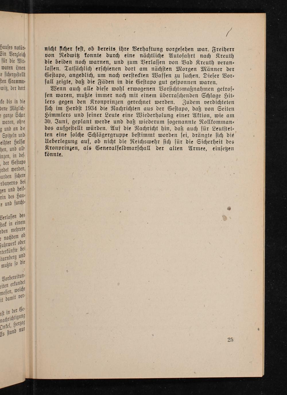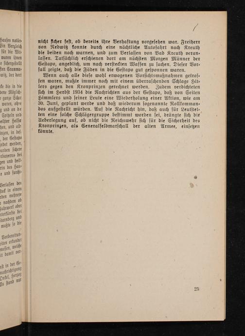 Wenn auch alle diese wohl erwogenen Vorsichtsmaßnahmen getroffen waren, mußte immer noch mit einem überraschenden Schlage Hitlers gegen den Kronprinzen gerechnet werden. Zudem verdichteten sich im Herbst 1934 die Nachrichten aus der Gestapo , daß von Seiten Himmlers und seiner Leute eine Wiederholung einer Aktion, wie am 30. Juni, geplant werde und daß wiederum sogenannte Rollkommandos aufgestellt würden. Auf die Nachricht hin, daß auch für Leutstetten eine solche Schlägergruppe bestimmt worden sei, drängte sich die Ueberlegung auf, ob nicht die Reichswehr sich für die Sicherheit des Kronprinzen, als Generalfeldmarschall der alten Armee, einsetzen könnte.