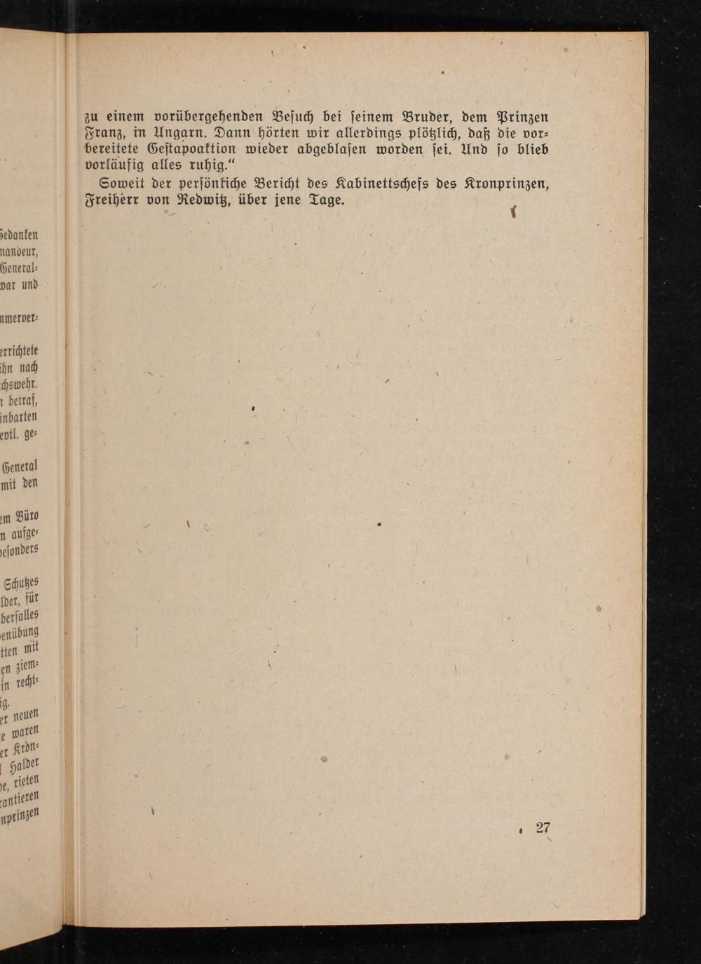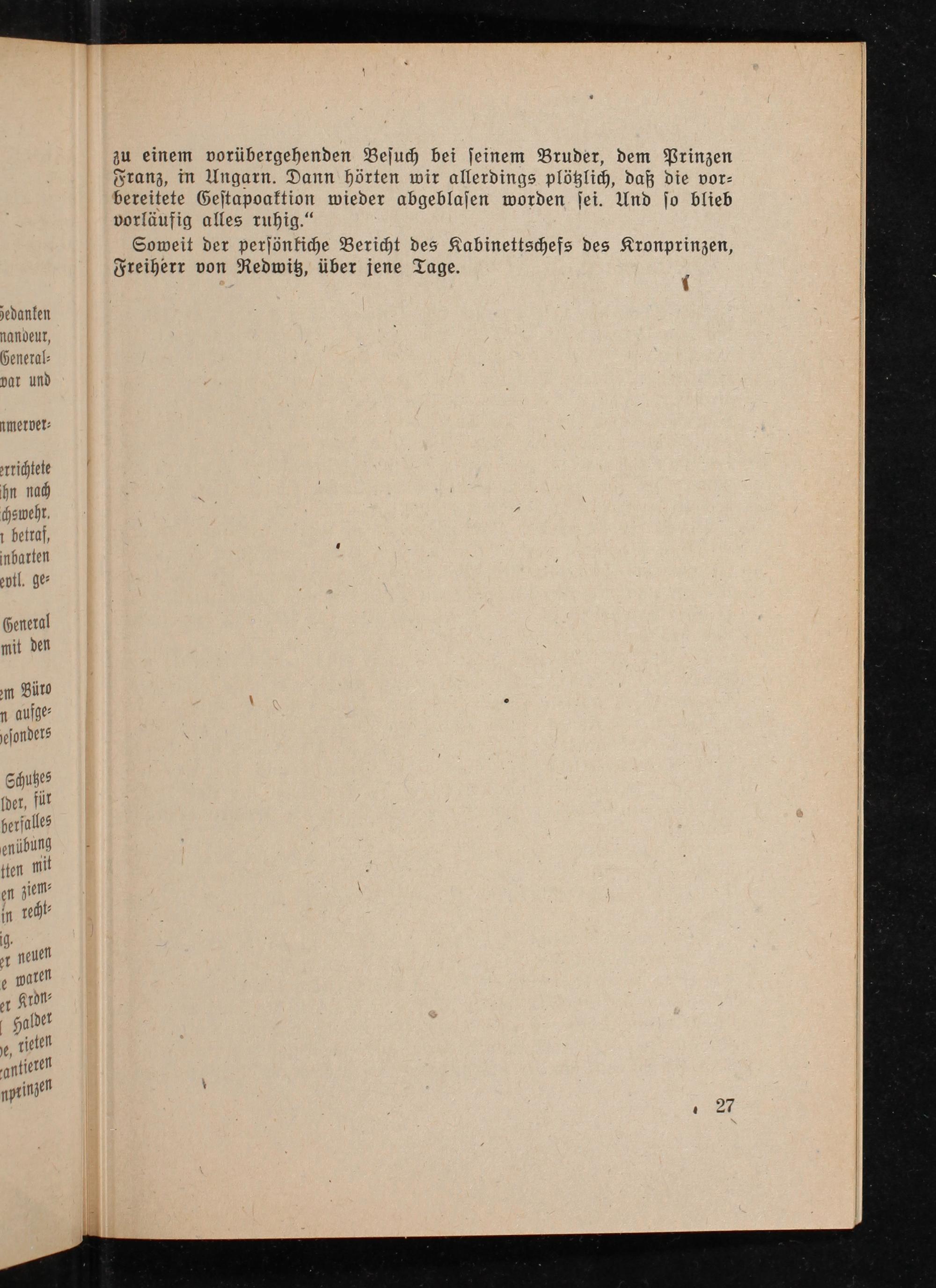 Soweit der persönliche Bericht des Kabinettschefs des Kronprinzen, Freiherr von Redwig, über jene Tage.