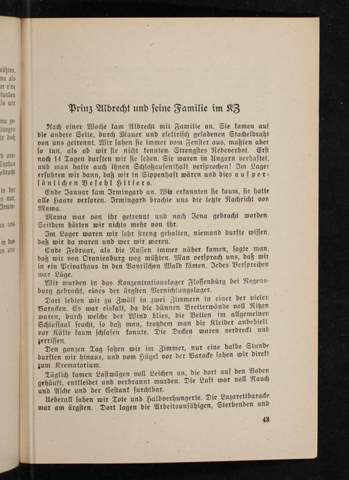 Nach einer Woche kam Albrecht mit Familie an. Sie famen auf die andere Seite, durch Mauer und elektrisch geladenen Stacheldraht von uns getrennt. Wir sahen sie immer vom Fenster aus, mußten aber so tun, als ob wir sie nicht fennten. Strengstes Redeverbot. Erst nach 14 Tagen durften wir sie sehen. Sie waren in Ungarn verhaftet, und man hatte auch ihnen Schloßaufenthalt versprochen! Im Lager erfuhren wir dann, daß wir in Sippenhaft wären und dies a ufpersönlichen Befehl Hitlers .