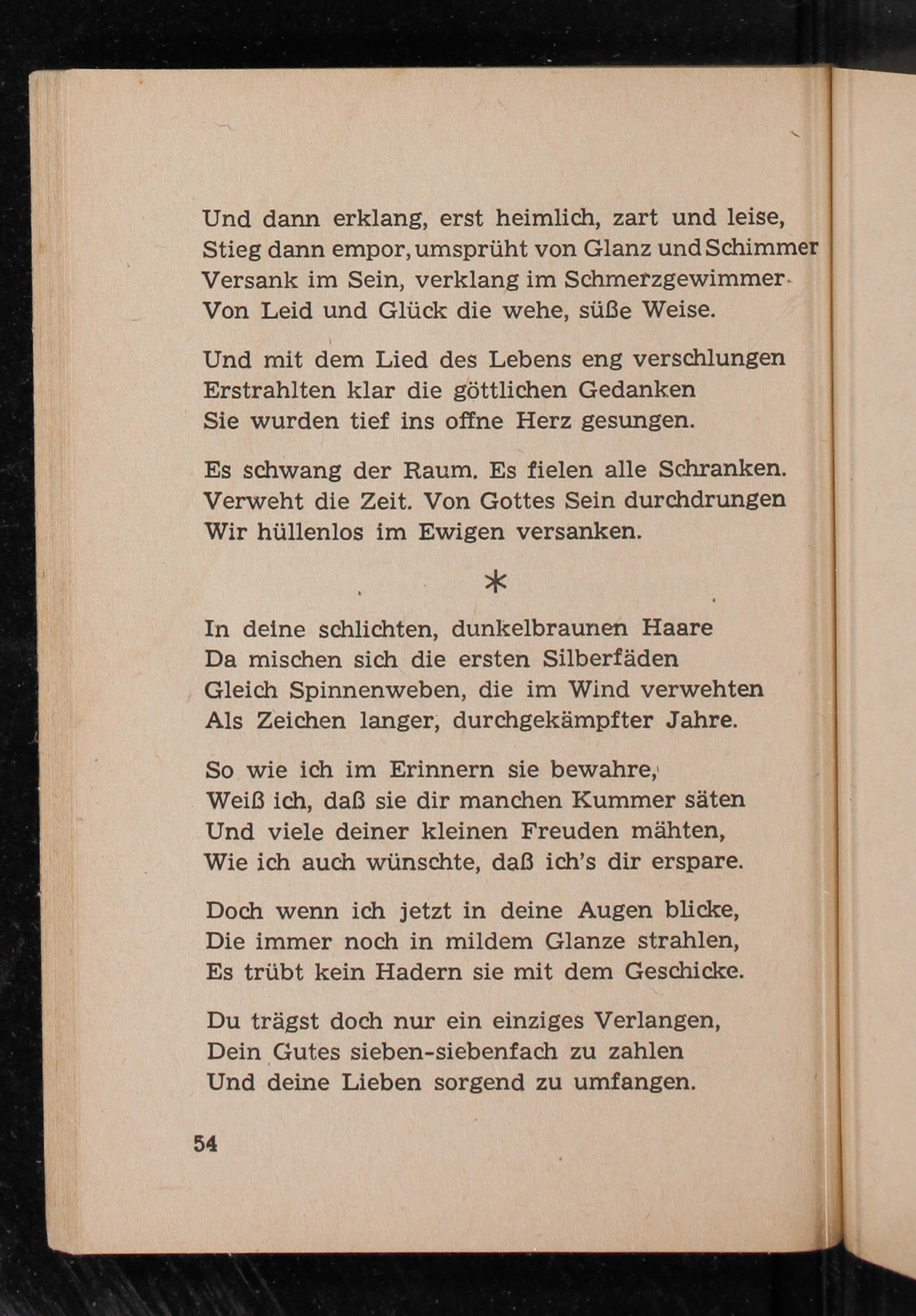 Und mit dem Lied des Lebens eng verschlungen Erstrahlten klar die göttlichen Gedanken Sie wurden tief ins offne Herz gesungen.
