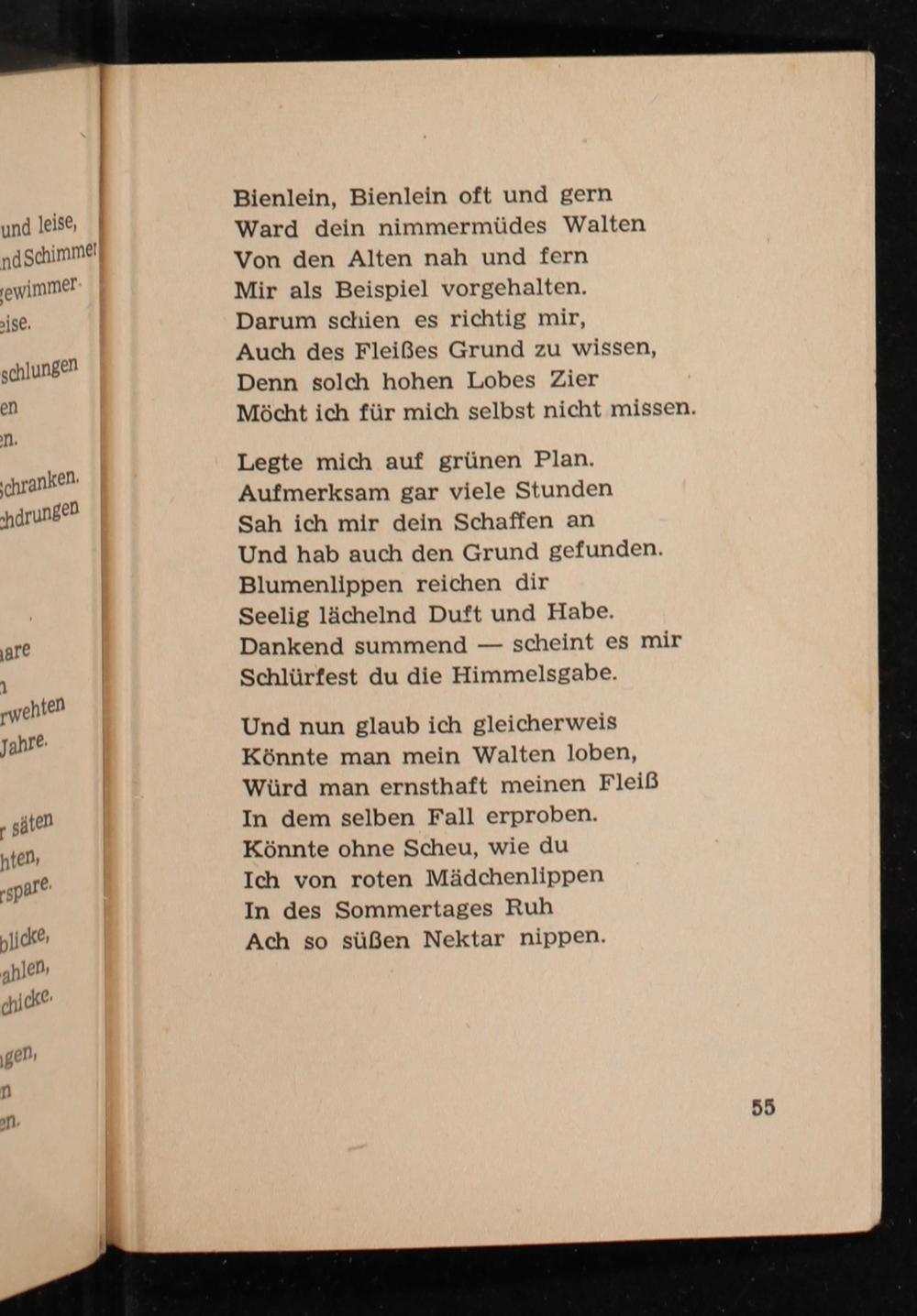 Bienlein, Bienlein oft und gern Ward dein nimmermüdes Walten Von den Alten nah und fern Mir als Beispiel vorgehalten. Darum schien es richtig mir, Auch des Fleißes Grund zu wissen, Denn solch hohen Lobes Zier Möcht ich für mich selbst nicht missen.