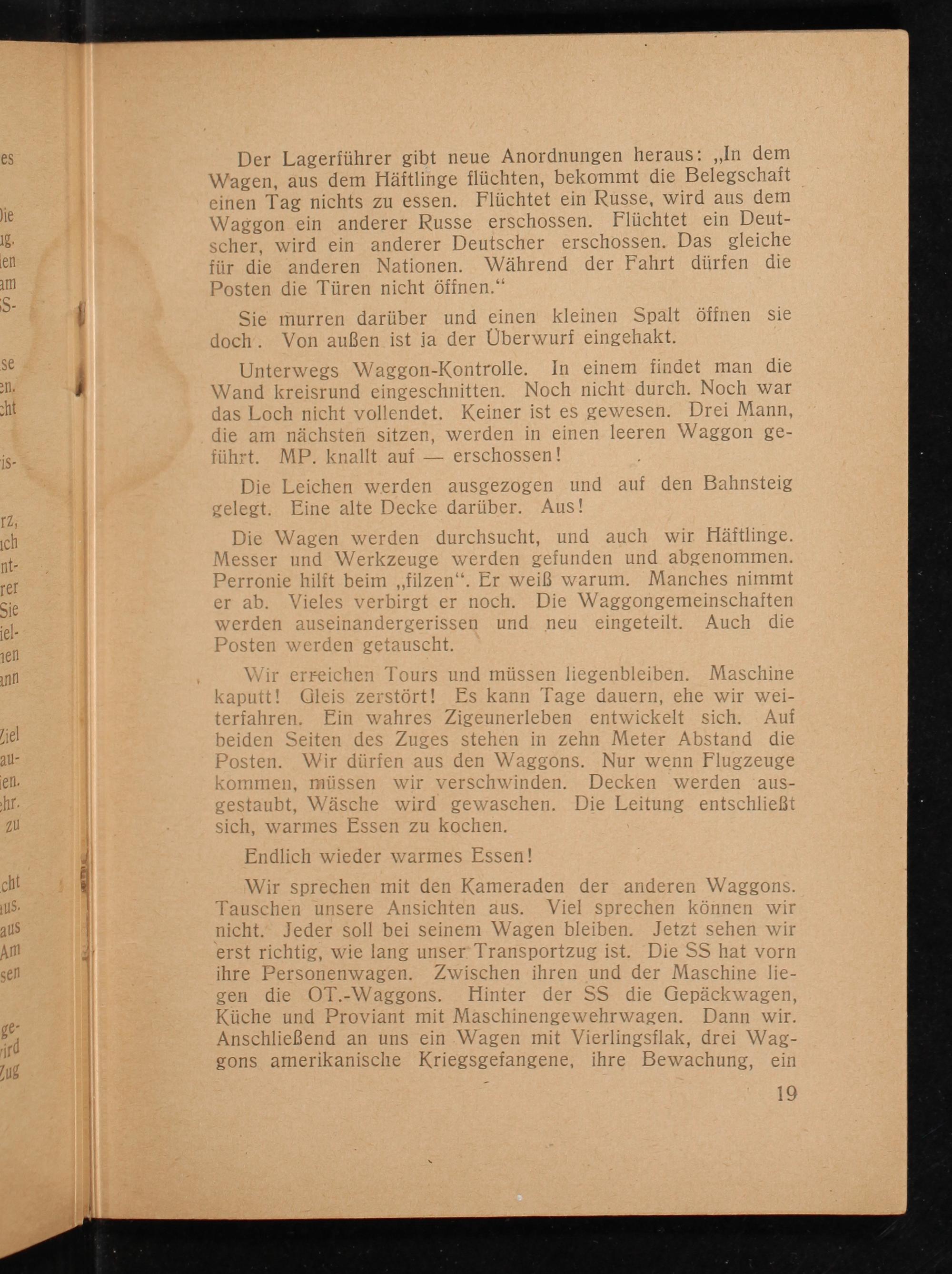 Der Lagerführer gibt neue Anordnungen heraus: ,, In dem Wagen, aus dem Häftlinge flüchten, bekommt die Belegschaft einen Tag nichts zu essen. Flüchtet ein Russe, wird aus dem Waggon ein anderer Russe erschossen. Flüchtet ein Deutscher, wird ein anderer Deutscher erschossen. Das gleiche für die anderen Nationen. Während der Fahrt dürfen die Posten die Türen nicht öffnen."