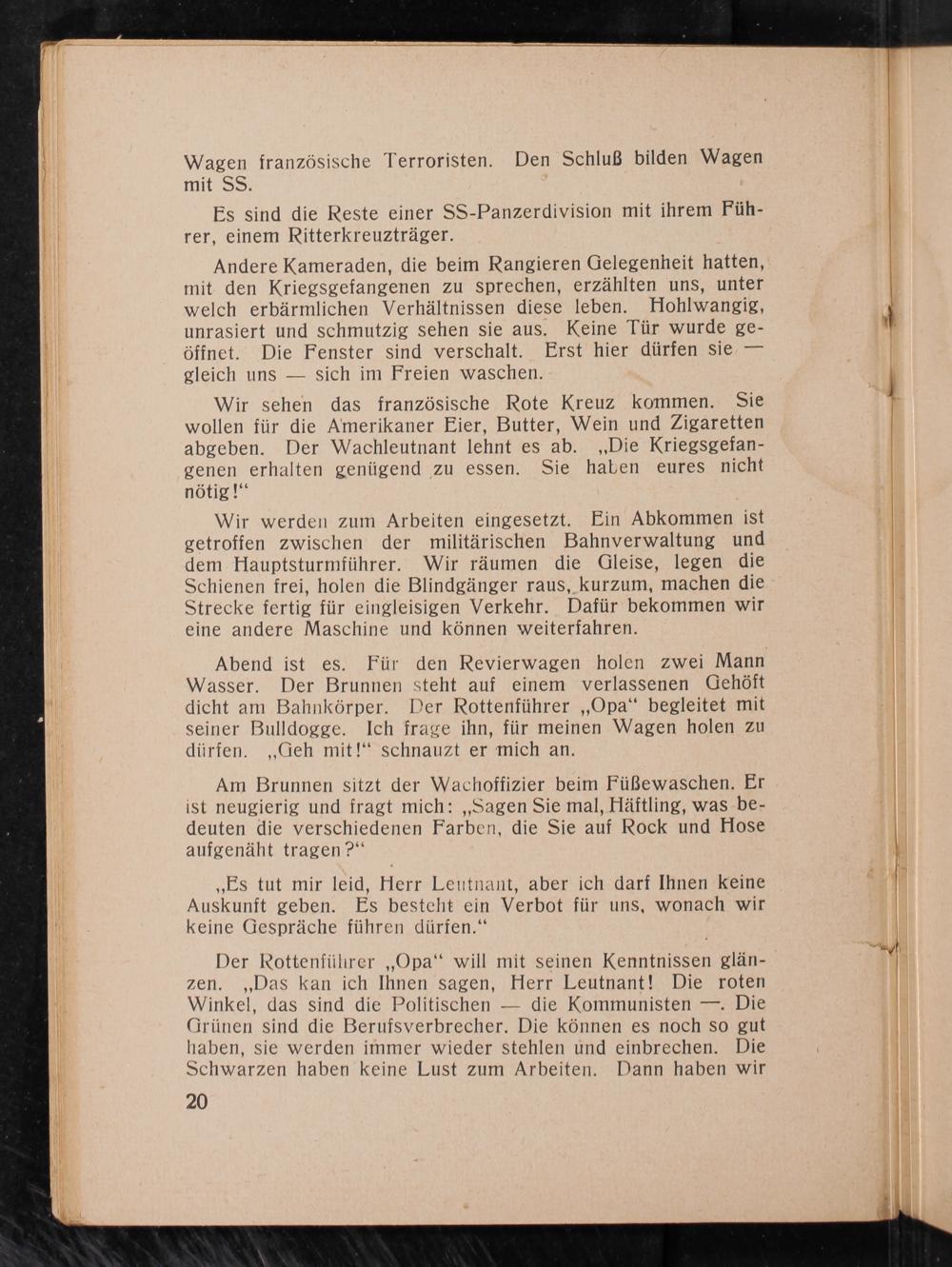 Der Rottenführer ,, Opa" will mit seinen Kenntnissen glänzen. ,, Das kan ich Ihnen sagen, Herr Leutnant! Die roten Winkel, das sind die Politischen die Kommunisten-. Die Grünen sind die Berufsverbrecher. Die können es noch so gut haben, sie werden immer wieder stehlen und einbrechen. Die Schwarzen haben keine Lust zum Arbeiten. Dann haben wir