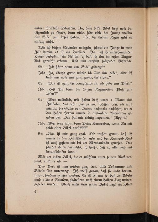 Er:„ Aber natürlich, wir haben doch unter 4 Mann eine Zeltbahn, das geht ganz prima. Wissen Sie, ich muß nämlich die Sache von Petrus nochmals nachlesen, wo er den hohen Herren immer so anständige Antworten gegeben hat. Das hat mir richtig imponiert."( Apg. 4.) Jch: ,, Aber was sagen denn Deine Kameraden, wenn Du mit solch einer Bibel anrückst?"