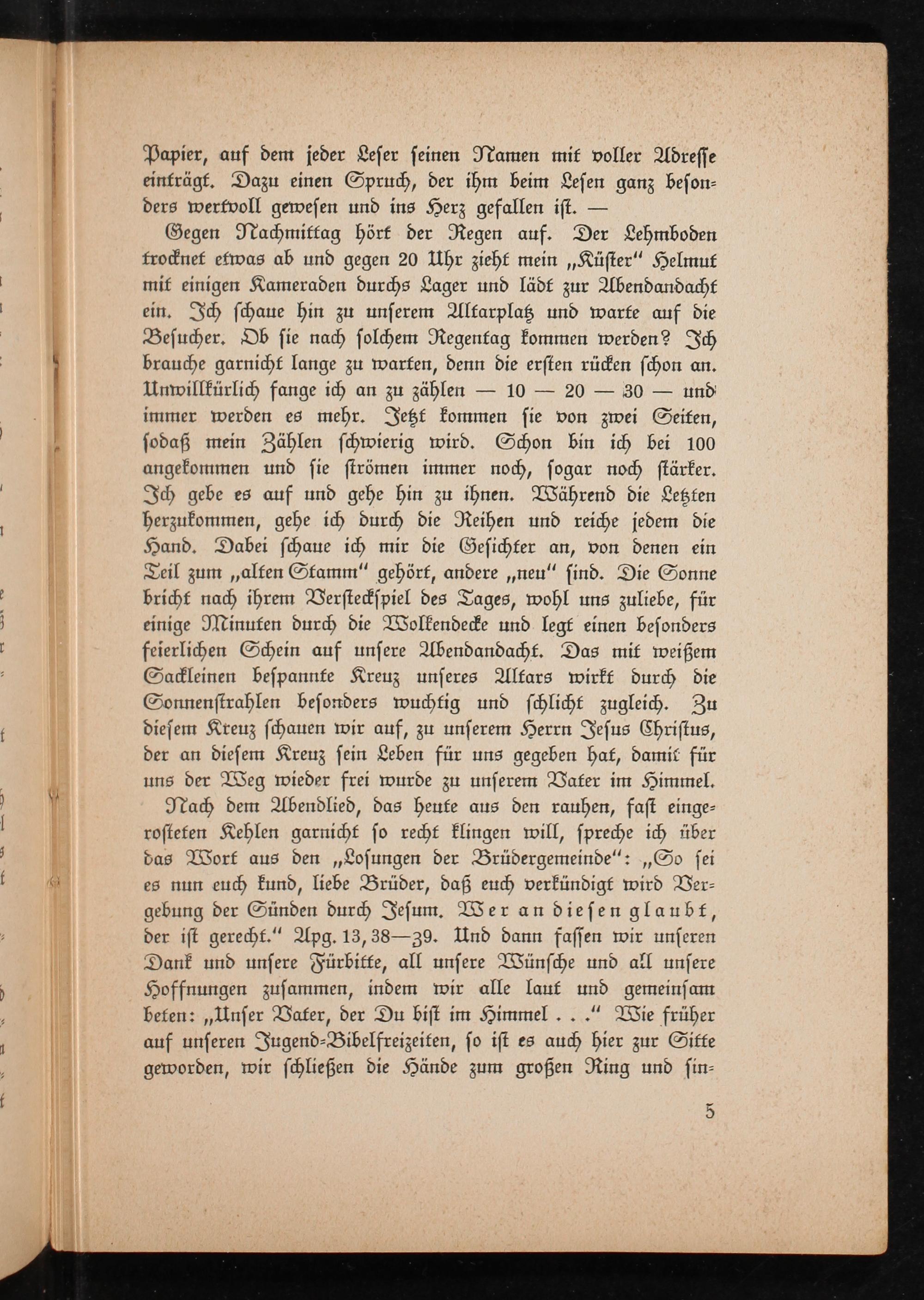 Nach dem Abendlied, das heute aus den rauhen, fast eingerosteten Kehlen garnicht so recht klingen will, spreche ich über das Wort aus den„ Losungen der Brüdergemeinde“:„ So sei es nun euch kund, liebe Brüder, daß euch verkündigt wird Vergebung der Sünden durch Jesum. Wer an diesen glaubt, der ist gerecht." Apg. 13, 38-39. Und dann fassen wir unseren Dank und unsere Fürbitte, all unsere Wünsche und all unsere Hoffnungen zusammen, indem wir alle laut und gemeinsam beten: ,, Unser Vater, der Du bist im Himmel..." Wie früher auf unseren Jugend- Bibelfreizeiten, so ist es auch hier zur Sitte geworden, wir schließen die Hände zum großen Ring und sin