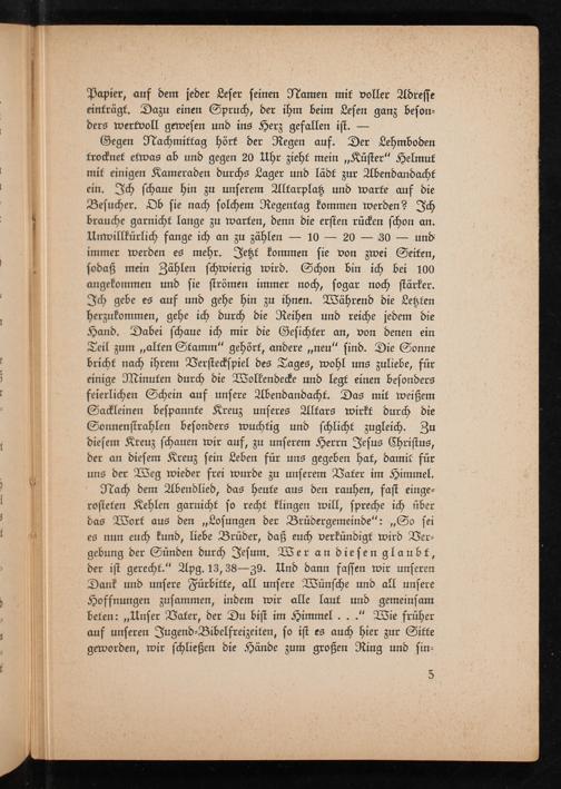 Gegen Nachmittag hört der Regen auf. Der Lehmboden frocknet etwas ab und gegen 20 Uhr zieht mein ,, Küster" Helmut mit einigen Kameraden durchs Lager und lädt zur Abendandacht ein. Ich schaue hin zu unserem Altarplaz und warte auf die Besucher. Db sie nach solchem Regentag kommen werden? Ich brauche garnicht lange zu warfen, denn die ersten rücken schon an. Umvillkürlich fange ich an zu zählen 30 und immer werden es mehr. Jezt kommen sie von zwei Seiten, sodaß mein Zählen schwierig wird. Schon bin ich bei 100 angekommen und sie strömen immer noch, sogar noch stärker. Ich gebe es auf und gehe hin zu ihnen. Während die Letzten herzukommen, gehe ich durch die Reihen und reiche jedem die Hand. Dabei schaue ich mir die Gesichter an, von denen ein Teil zum ,, alten Stamm" gehört, andere ,, neu" sind. Die Sonne bricht nach ihrem Versteckspiel des Tages, wohl uns zuliebe, für einige Minuten durch die Wolkendecke und legt einen besonders feierlichen Schein auf unsere Abendandacht. Das mit weißem Sackleinen bespannte Kreuz unseres Altars wirkt durch die Sonnenstrahlen besonders wuchtig und schlicht zugleich. Zu diesem Kreuz schauen wir auf, zu unserem Herrn Jesus Christus , der an diesem Kreuz sein Leben für uns gegeben hat, damit für uns der Weg wieder frei wurde zu unserem Vater im Himmel.