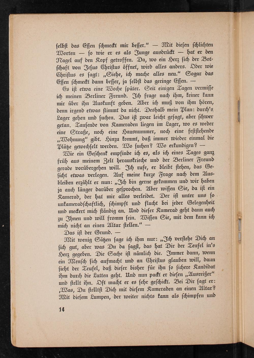 Wie ein Geschenk empfinde ich es, als ich eines Tages ganz früh aus meinem Zelt herauskrieche und der Berliner Freund gerade vorübergehen will. Ich rufe, er bleibt stehen, das Gesicht etwas verlegen. Auf meine kurze Frage nach dem Ausbleiben erzählt er nun:„ Ich bin gerne gekommen und wir haben ja auch länger darüber gesprochen. Aber wissen Sie, da ist ein Kamerad, der hat mir alles verleidet. Der ist unter uns so unkameradschaftlich, schimpft und flucht bei jeder Gelegenheit und meckert mich ständig an. Und dieser Kamerad geht dann auch zu Ihnen und will fromm sein. Wissen Sie, mit dem kann ich mich nicht an einen Altar stellen."
