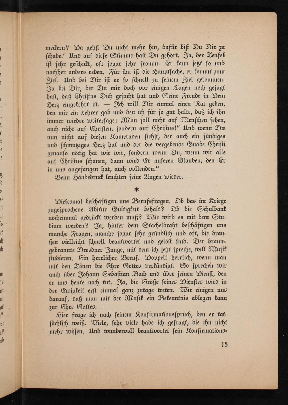 Diesesmal beschäftigen uns Berufsfragen. Db das im Kriege zugesprochene Abitur Gültigkeit behält? Db die Schulbank nocheinmal gedrückt werden muß? Wie wird es mit dem Studium werden? Ja, hinter dem Stacheldraht beschäftigen uns manche Fragen, manche sogar sehr gründlich und oft, die drauBen vielleicht schnell beantwortet und gelöst sind. Der braungebrannte Dresdner Junge, mit dem ich jetzt spreche, will Musik studieren. Ein herrlicher Beruf. Doppelt herrlich, wenn man mit den Tönen die Ehre Goffes verkündigt. So sprechen wir auch über Johann Sebastian Bach und über seinen Dienst, den er uns heute noch tut. Ja, die Größe seines Dienstes wird in der Ewigkeit erst einmal ganz zufage freten. Wir einigen uns darauf, daß man mit der Musik ein Bekenntnis ablegen kann zur Ehre Goffes.