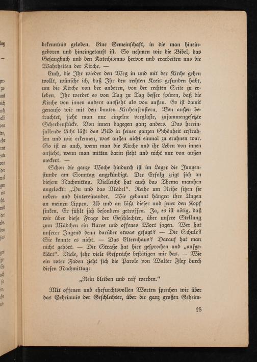Schon die ganze Woche hindurch ist im Lager die Jungenstunde am Sonntag angekündigt. Der Erfolg zeigt sich an diesem Nachmittag. Vielleicht hat auch das Thema manchen angelockt: ,, Du und das Mädel". Reihe um Reihe sizen sie neben- und hintereinander. Wie gebannt hängen ihre Augen an meinen Lippen. Ab und an läßt dieser und jener den Kopf sinken. Er fühlt sich besonders getroffen. Ja, es ist nötig, daß wir über diese Frage der Geschlechter, über unsere Stellung zum Mädchen ein klares und offenes Wort sagen. Wer hat unserer Jugend denn darüber etwas gesagt? Die Schule? Sie konnte es nicht. Das Elternhaus? Darauf hat man nicht gehört. Die Straße hat hier gesprochen und ,, aufgeWie klärt". Viele, sehr viele Gespräche bestätigen mir das. ein roter Faden zieht sich die Parole von Walter Fler durch diesen Nachmittag: