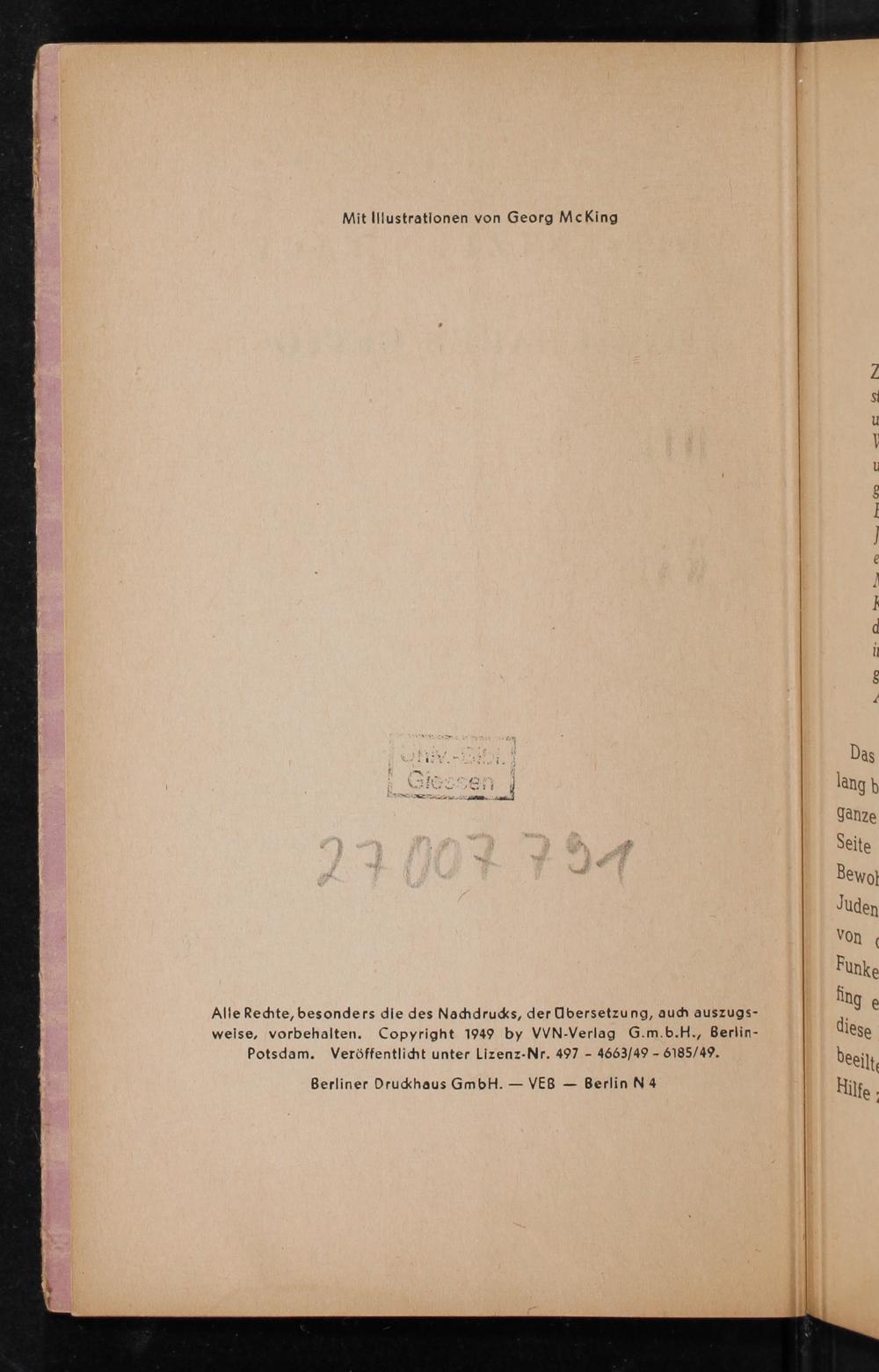 Alle Rechte, besonders die des Nachdrucks, der Übersetzung, auch auszugsweise, vorbehalten. Copyright 1949 by VVN- Verlag G.m.b.H., BerlinPotsdam. Veröffentlicht unter Lizenz- Nr. 497- 4663/ 49-6185/ 49.