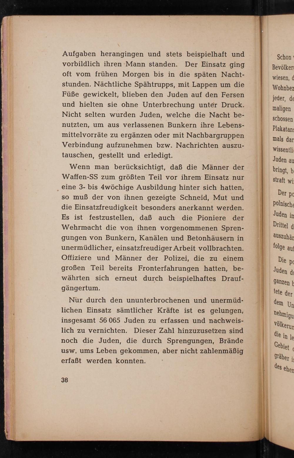 Nur durch den ununterbrochenen und unermüdlichen Einsatz sämtlicher Kräfte ist es gelungen, insgesamt 56 065 Juden zu erfassen und nachweislich zu vernichten. Dieser Zahl hinzuzusetzen sind noch die Juden, die durch Sprengungen, Brände usw. ums Leben gekommen, aber nicht zahlenmäßig erfaßt werden konnten.