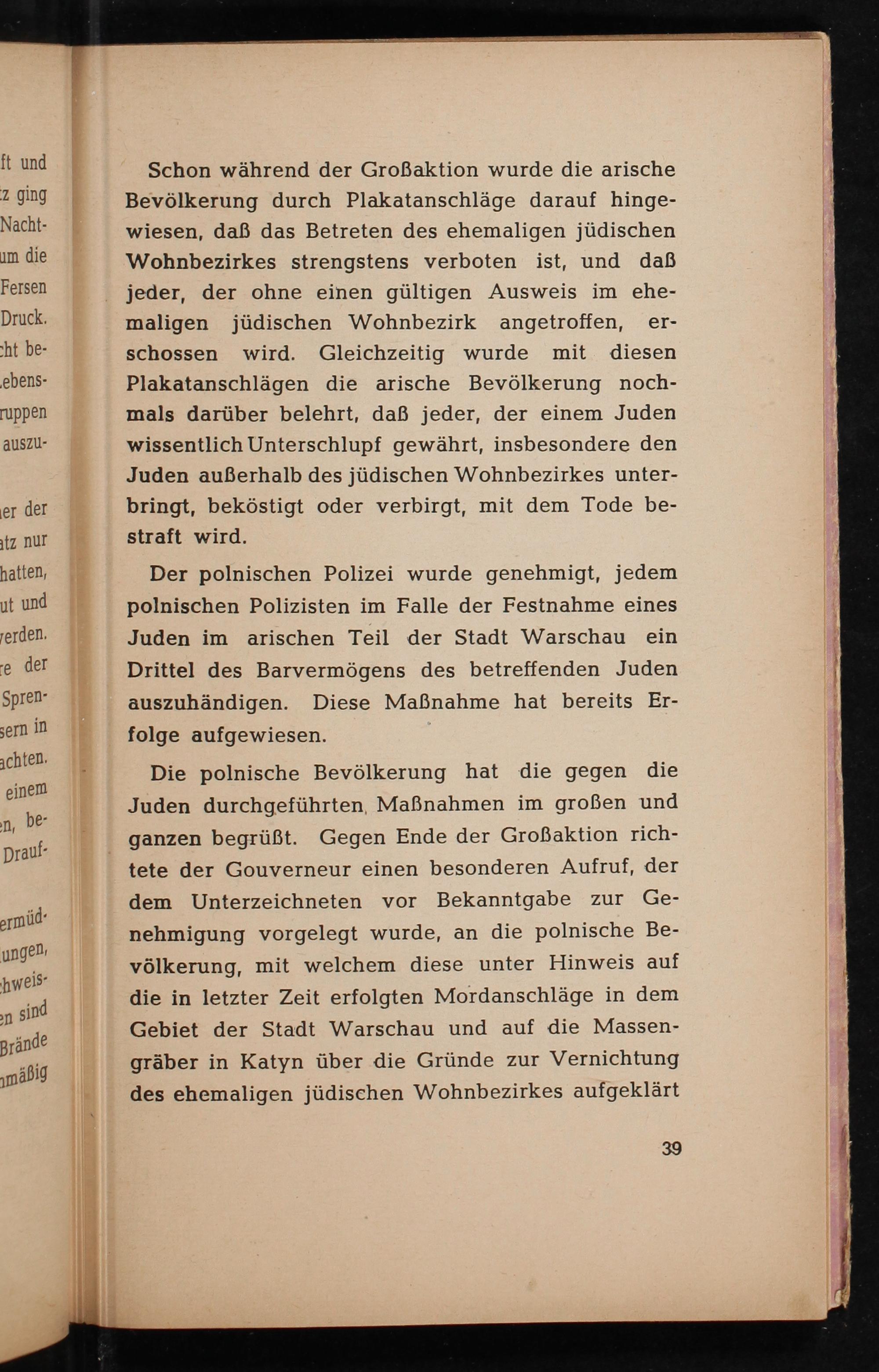 Die polnische Bevölkerung hat die gegen die Juden durchgeführten, Maßnahmen im großen und ganzen begrüßt. Gegen Ende der Großaktion richtete der Gouverneur einen besonderen Aufruf, der dem Unterzeichneten vor Bekanntgabe zur Genehmigung vorgelegt wurde, an die polnische Bevölkerung, mit welchem diese unter Hinweis auf die in letzter Zeit erfolgten Mordanschläge in dem Gebiet der Stadt Warschau und auf die Massengräber in Katyn über die Gründe zur Vernichtung des ehemaligen jüdischen Wohnbezirkes aufgeklärt