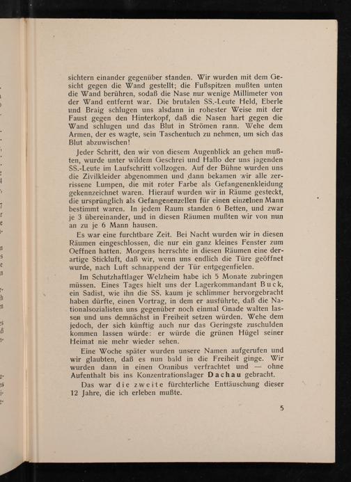 Im Schutzhaftlager Welzheim habe ich 5 Monate zubringen müssen. Eines Tages hielt uns der Lagerkommandant Buck, ein Sadist, wie ihn die SS. kaum je schlimmer hervorgebracht haben dürfte, einen Vortrag, in dem er ausführte, daß die Na- tionalsozialisten uns gegenüber noch einmal Gnade walten las- sen und uns demnächst in Freiheit setzen würden. Wehe dem jedoch, der sich künftig auch nur das Geringste zuschulden kommen lassen würde: er würde die grünen Hügel seiner Heimat nie mehr wieder sehen.