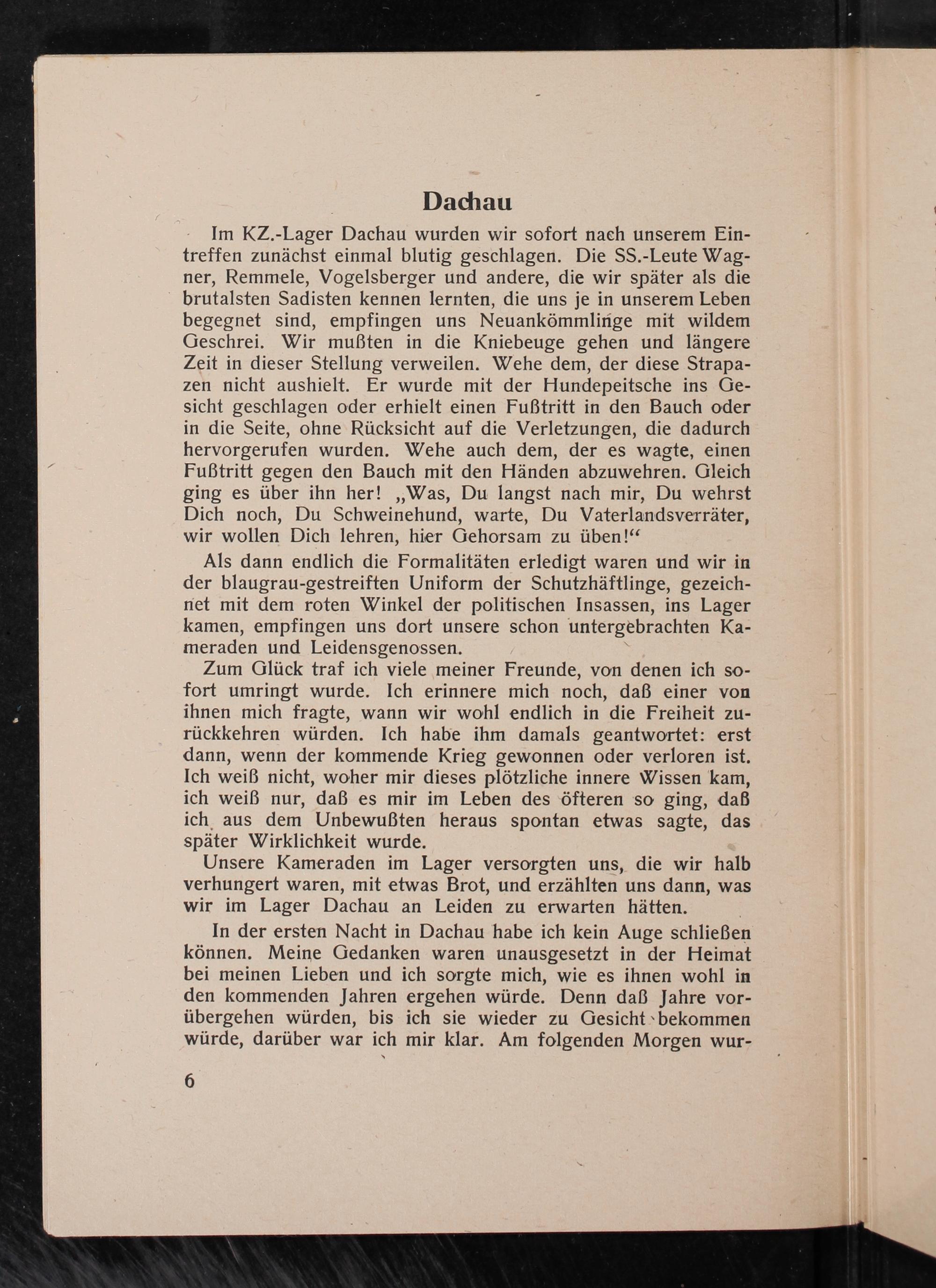 Im KZ.- Lager Dachau wurden wir sofort nach unserem Eintreffen zunächst einmal blutig geschlagen. Die SS. - Leute Wagner, Remmele, Vogelsberger und andere, die wir später als die brutalsten Sadisten kennen lernten, die uns je in unserem Leben begegnet sind, empfingen uns Neuankömmlinge mit wildem Geschrei. Wir mußten in die Kniebeuge gehen und längere Zeit in dieser Stellung verweilen. Wehe dem, der diese Strapazen nicht aushielt. Er wurde mit der Hundepeitsche ins Gesicht geschlagen oder erhielt einen Fußtritt in den Bauch oder in die Seite, ohne Rücksicht auf die Verletzungen, die dadurch hervorgerufen wurden. Wehe auch dem, der es wagte, einen Fuẞtritt gegen den Bauch mit den Händen abzuwehren. Gleich ging es über ihn her! ,, Was, Du langst nach mir, Du wehrst Dich noch, Du Schweinehund, warte, Du Vaterlandsverräter, wir wollen Dich lehren, hier Gehorsam zu üben!"