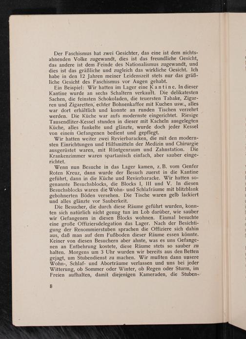 Der Faschismus hat zwei Gesichter, das eine ist dem nichtsahnenden Volke zugewandt, dies ist das freundliche Gesicht, das andere ist dem Feinde des Nationalismus zugewandt, und dies ist das gräßliche und zugleich das wirkliche Gesicht. Ich habe in den 12 Jahren meiner Leidenszeit stets nur das gräßliche Gesicht des Faschismus vor Augen gehabt.