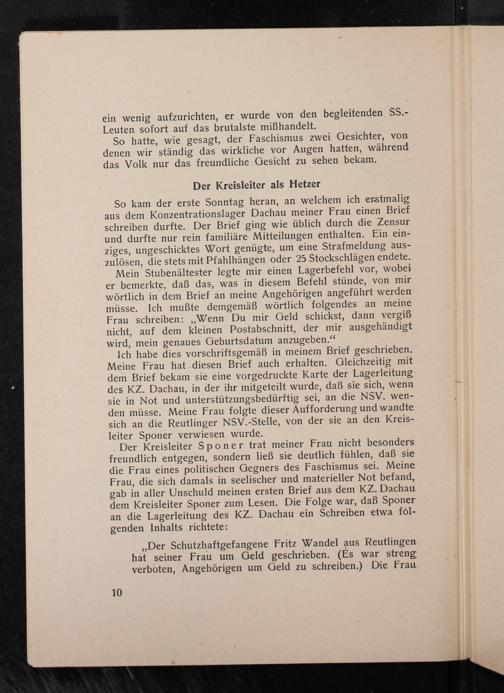 Der Kreisleiter Sponer trat meiner Frau nicht besonders freundlich entgegen, sondern ließ sie deutlich fühlen, daß sie die Frau eines politischen Gegners des Faschismus sei. Meine Frau, die sich damals in seelischer und materieller Not befand, gab in aller Unschuld meinen ersten Brief aus dem KZ. Dachau dem Kreisleiter Sponer zum Lesen. Die Folge war, daß Sponer an die Lagerleitung des KZ. Dachau ein Schreiben etwa fólgenden Inhalts richtete: