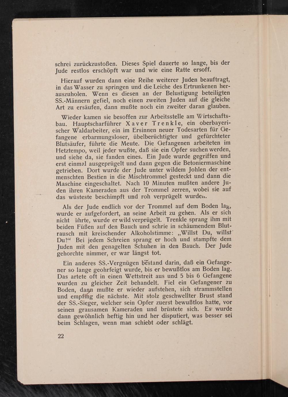 Wieder kamen sie besoffen zur Arbeitsstelle am Wirtschaftsbau. Hauptscharführer X aver Trenkle, ein oberbayerischer Waldarbeiter, ein im Ersinnen neuer Todesarten für Gefangene erbarmungsloser, übelberüchtigter und gefürchteter Blutsäufer, führte die Meute. Die Gefangenen arbeiteten im Hetztempo, weil jeder wußte, daß sie ein Opfer suchen werden, und siehe da, sie fanden eines. Ein Jude wurde gegriffen und erst einmal ausgeprügelt und dann gegen die Betoniermaschine getrieben. Dort wurde der Jude unter wildem Johlen der entmenschten Bestien in die Mischtrommel gesteckt und dann die Maschine eingeschaltet. Nach 10 Minuten mußten andere Juden ihren Kameraden aus der Trommel zerren, wobei sie auf das wüsteste beschimpft und roh verprügelt wurden.