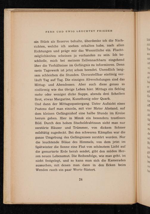 Und dann der Mittagsspaziergang. Unter Aufsicht eines Postens darf man einzeln, mit vier Meter Abstand, auf dem kleinen Gefängnishof eine halbe Stunde im Kreise herum gehen. Hier in Minsk ein besonders trostloses Bild. Durch den hohen Stacheldrahtzaun sieht man nur zerstörte Häuser und Trümmer, von dickem Schnee mildtätig zugedeckt. Bei den schweren Kämpfen war die ganze Umgebung des Gefängnisses zerstört worden. Nur die leuchtende Bläue des Himmels, von dem jetzt im Spätwinter die Sonne eine Flut von schönstem Licht auf die gemarterte Erde herab sendet, gibt den müden Herzen neuen Lebensmut. Die Reihenfolge, wie man geht, ist nicht festgelegt, und so kann man sich die Kameraden aussuchen, mit denen man dann in den Ecken beim Wenden rasch ein paar Worte flüstert.