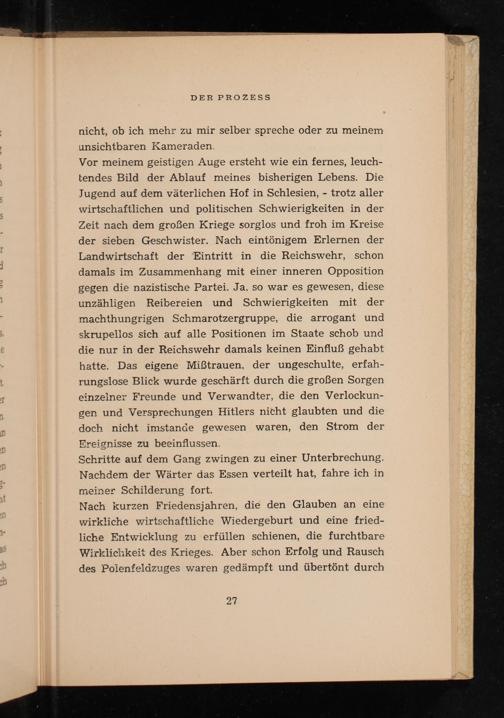 Vor meinem geistigen Auge ersteht wie ein fernes, leuch- tendes Bild der Ablauf meines bisherigen Lebens. Die Jugend auf dem väterlichen Hof in Schlesien ,- trotz aller wirtschaftlichen und politischen Schwierigkeiten in der Zeit nach dem großen Kriege sorglos und froh im Kreise der sieben Geschwister. Nach eintönigem Erlernen der Landwirtschaft der Eintritt in die Reichswehr , schon damals im Zusammenhang mit einer inneren Opposition gegen die nazistische Partei. Ja, so war es gewesen, diese unzähligen Reibereien und Schwierigkeiten mit der machthungrigen Schmarotzergruppe, die arrogant und skrupellos sich auf alle Positionen im Staate schob und die nur in der Reichswehr damals keinen Einfluß gehabt hatte. Das eigene Mißtrauen, der ungeschulte, erfah- rungslose Blick wurde geschärft durch die großen Sorgen einzeiner Freunde und Verwandter, die den Verlockun- gen und Versprechungen Hitlers nicht glaubten und die doch nicht imstande gewesen waren, den Strom der Ereignisse zu beeinflussen.