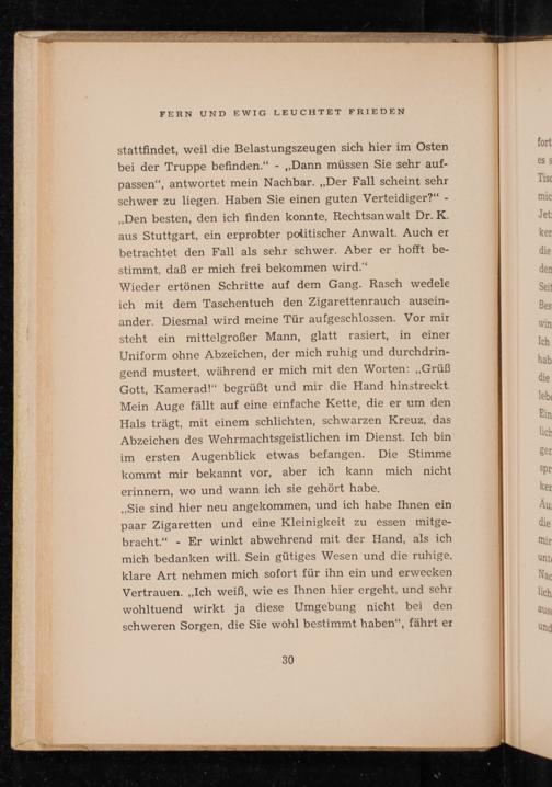 Wieder ertönen Schritte auf dem Gang. Rasch wedele ich mit dem Taschentuch den Zigarettenrauch ausein- ander. Diesmal wird meine Tür aufgeschlossen. Vor mir steht ein mittelgroßer Mann, glatt rasiert, in einer Uniform ohne Abzeichen, der mich ruhig und durchdrin- gend mustert, während er mich mit den Worten:„Grüß Gott, Kamerad!“ begrüßt und mir die Hand hinstreckt. Mein Auge fällt auf eine einfache Kette, die er um den Hals trägt, mit einem schlichten, schwarzen Kreuz, das Abzeichen des Wehrmachtsgeistlichen im Dienst. Ich bin im ersten Augenblick etwas befangen. Die Stimme kommt mir bekannt vor, aber ich kann mich nicht erinnern, wo und wann ich sie gehört habe.