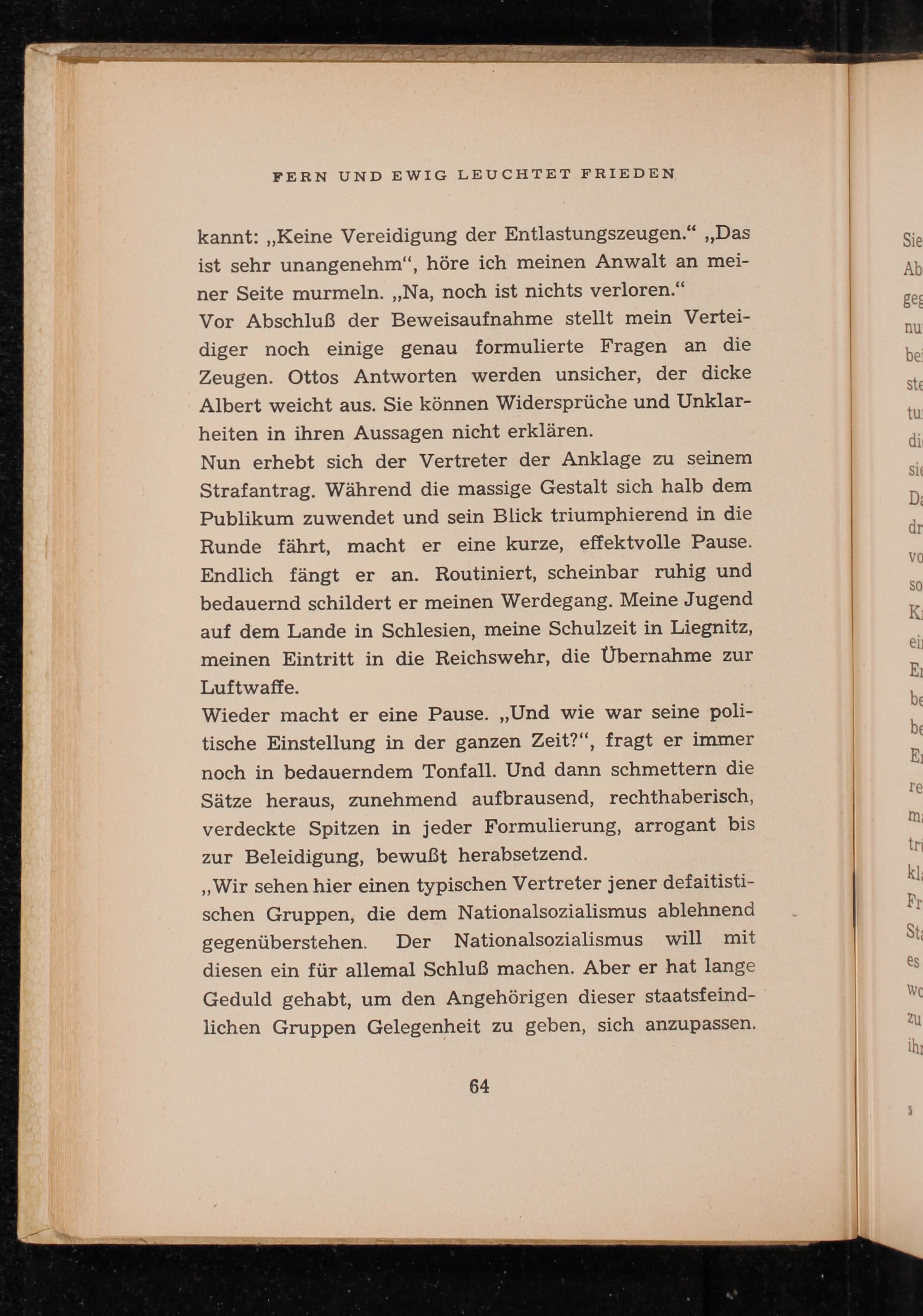 Nun erhebt sich der Vertreter der Anklage zu seinem Strafantrag. Während die massige Gestalt sich halb dem Publikum zuwendet und sein Blick triumphierend in die Runde fährt, macht er eine kurze, effektvolle Pause. Endlich fängt er an. Routiniert, scheinbar ruhig und bedauernd schildert er meinen Werdegang. Meine Jugend auf dem Lande in Schlesien, meine Schulzeit in Liegnitz , meinen Eintritt in die Reichswehr , die Übernahme zur Luftwaffe.