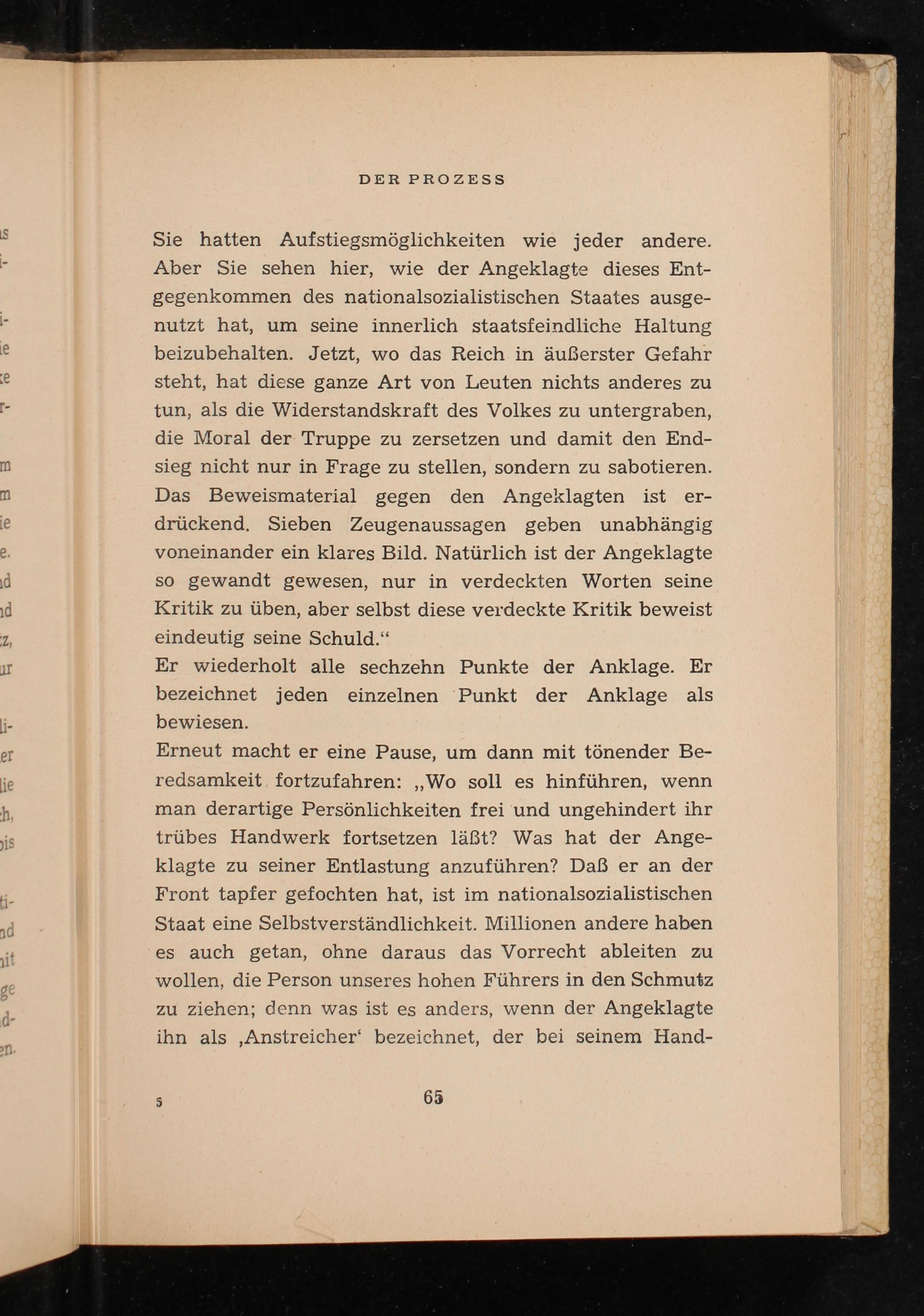 Sie hatten Aufstiegsmöglichkeiten wie jeder andere. Aber Sie sehen hier, wie der Angeklagte dieses Ent- gegenkommen des nationalsozialistischen Staates ausge- nutzt hat, um seine innerlich staatsfeindliche Haltung beizubehalten. Jetzt, wo das Reich in äußerster Gefahr steht, hat diese ganze Art von Leuten nichts anderes zu tun, als die Widerstandskraft des Volkes zu untergraben, die Moral der Truppe zu zersetzen und damit den End- sieg nicht nur in Frage zu stellen, sondern zu sabotieren. Das Beweismaterial gegen den Angeklagten ist er- drückend. Sieben Zeugenaussagen geben unabhängig voneinander ein klares Bild. Natürlich ist der Angeklagte so gewandt gewesen, nur in verdeckten Worten seine Kritik zu üben, aber selbst diese verdeckte Kritik beweist eindeutig seine Schuld.“