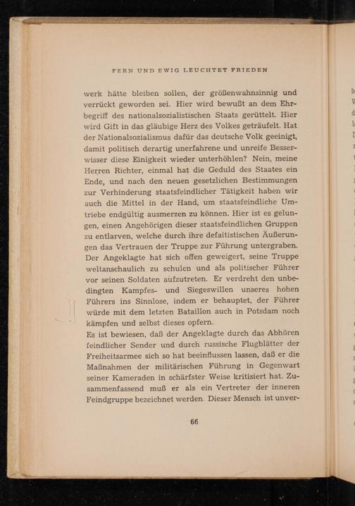 werk hätte bleiben sollen, der größenwahnsinnig und verrückt geworden sei. Hier wird bewußt an dem Ehrbegriff des nationalsozialistischen Staats gerüttelt. Hier wird Gift in das gläubige Herz des Volkes geträufelt. Hat der Nationalsozialismus dafür das deutsche Volk geeinigt, damit politisch derartig unerfahrene und unreife Besserwisser diese Einigkeit wieder unterhöhlen? Nein, meine Herren Richter, einmal hat die Geduld des Staates ein Ende, und nach den neuen gesetzlichen Bestimmungen zur Verhinderung staatsfeindlicher Tätigkeit haben wir auch die Mittel in der Hand, um staatsfeindliche Umtriebe endgültig ausmerzen zu können. Hier ist es gelungen, einen Angehörigen dieser staatsfeindlichen Gruppen zu entlarven, welche durch ihre defaitistischen Äußerungen das Vertrauen der Truppe zur Führung untergraben. Der Angeklagte hat sich offen geweigert, seine Truppe weltanschaulich zu schulen und als politischer Führer vor seinen Soldaten aufzutreten. Er verdreht den unbedingten Kampfes- und Siegeswillen unseres unseres hohen Führers ins Sinnlose, indem er behauptet, der Führer würde mit dem letzten Bataillon auch in Potsdam noch kämpfen und selbst dieses opfern.