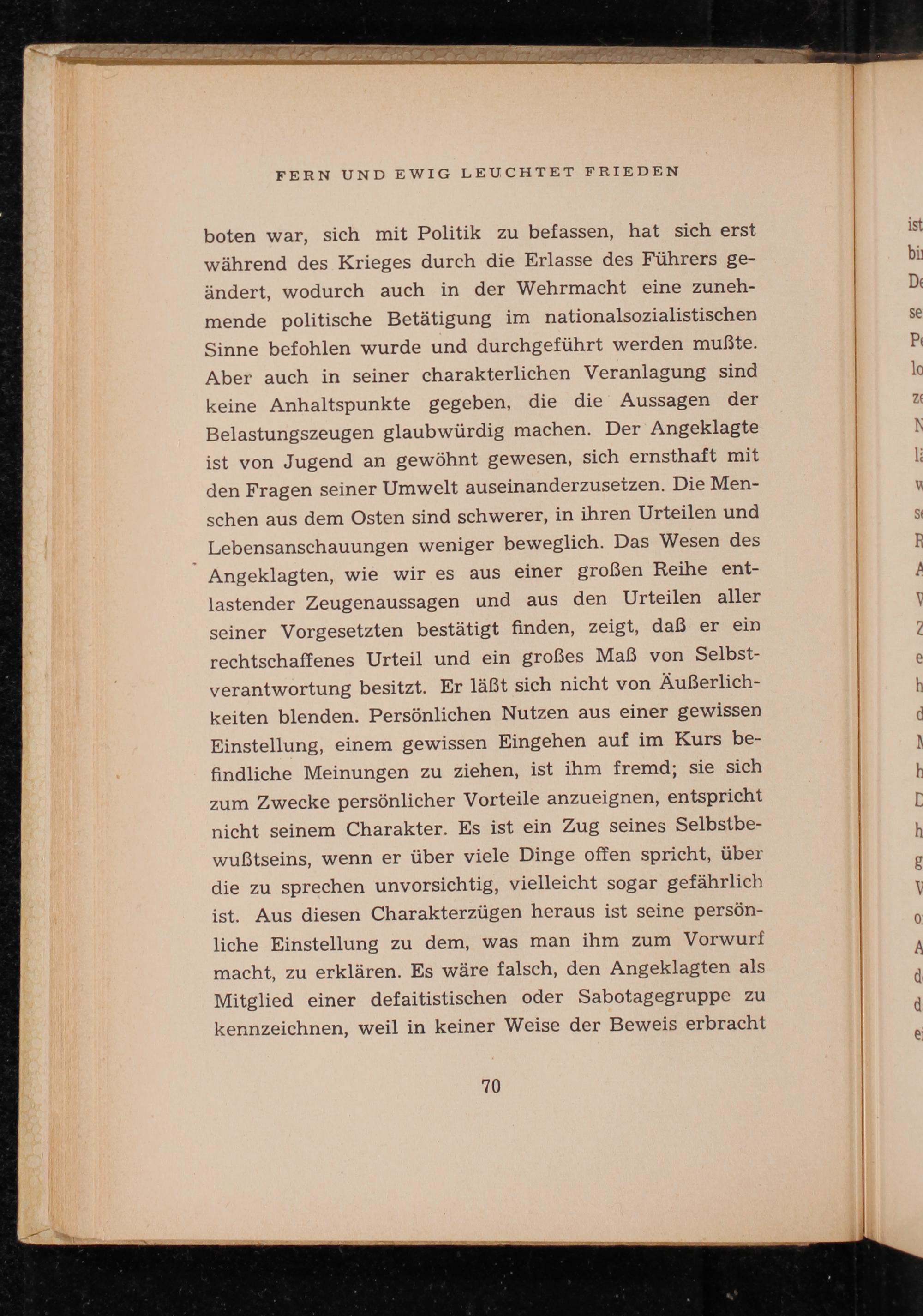 boten war, sich mit Politik zu befassen, hat sich erst während des Krieges durch die Erlasse des Führers ge- ändert, wodurch auch in der Wehrmacht eine zuneh- mende politische Betätigung im nationalsozialistischen Sinne befohlen wurde und durchgeführt werden mußte. Aber auch in seiner charakterlichen Veranlagung sind keine Anhaltspunkte gegeben, die die Aussagen der Belastungszeugen glaubwürdig machen. Der Angeklagte ist von Jugend an gewöhnt gewesen, sich ernsthaft mit den Fragen seiner Umwelt auseinanderzusetzen. Die Men- schen aus dem Osten sind schwerer, in ihren Urteilen und Lebensanschauungen weniger beweglich. Das Wesen des Angeklagten, wie wir es aus einer großen Reihe ent- lastender Zeugenaussagen und aus den Urteilen aller seiner Vorgesetzten bestätigt finden, zeigt, daß er ein rechtschaffenes Urteil und ein großes Maß von Selbst- verantwortung besitzt. Er läßt sich nicht von Außerlich- keiten blenden. Persönlichen Nutzen aus einer gewissen Einstellung, einem gewissen Eingehen auf im Kurs be- findliche Meinungen zu ziehen, ist ihm fremd; sie sich zum Zwecke persönlicher Vorteile anzueignen, entspricht nicht seinem Charakter. Es ist ein Zug seines Selbstbe- wußtseins, wenn er über viele Dinge offen spricht, über die zu sprechen unvorsichtig, vielleicht sogar gefährlich ist. Aus diesen Charakterzügen heraus ist seine persön- liche Einstellung zu dem, was man ihm zum Vorwurf macht, zu erklären. Es wäre falsch, den Angeklagten als Mitglied einer defaitistischen oder Sabotagegruppe zu kennzeichnen, weil in keiner Weise der Beweis erbracht