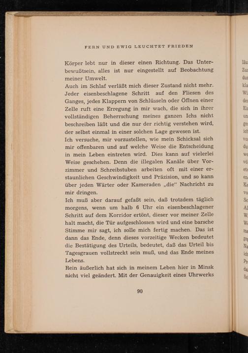 Auch im Schlaf verläßt mich dieser Zustand nicht mehr. Jeder eisenbeschlagene Schritt auf den Fliesen des Ganges, jedes Klappern von Schlüsseln oder Öffnen einer Zelle ruft eine Erregung in mir wach, die sich in ihrer vollständigen Beherrschung meines ganzen Ichs nicht beschreiben läßt und die nur der richtig verstehen wird, der selbst einmal in einer solchen Lage gewesen ist.