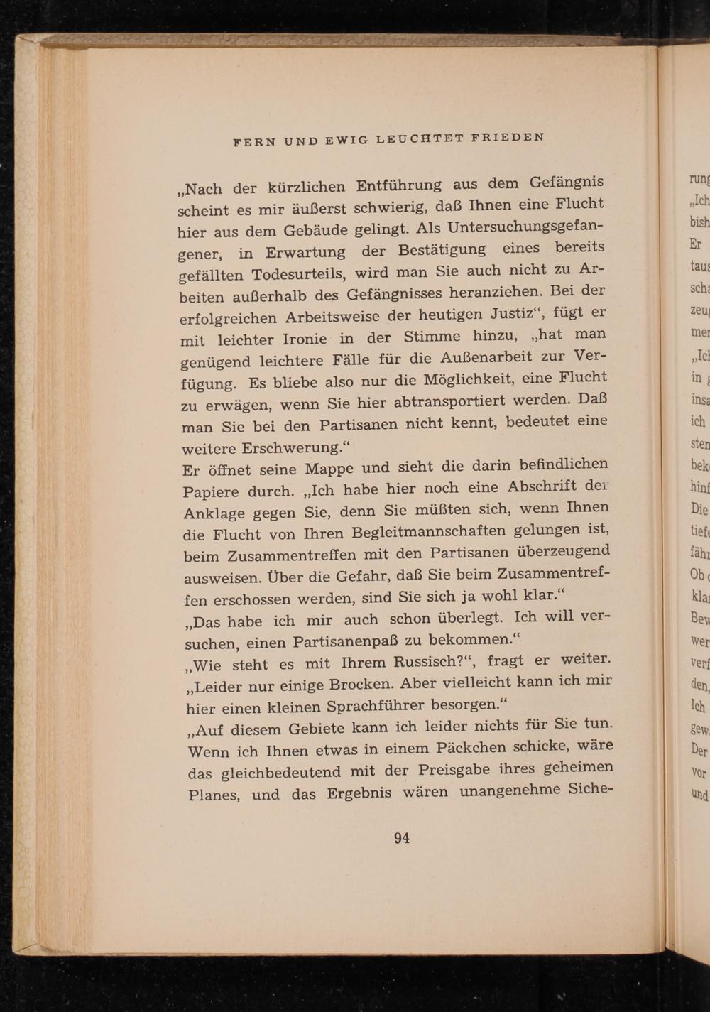 Er öffnet seine Mappe und sieht die darin befindlichen Papiere durch. ,, Ich habe hier noch eine Abschrift der Anklage gegen Sie, denn Sie müßten sich, wenn Ihnen die Flucht von Ihren Begleitmannschaften gelungen ist, beim Zusammentreffen mit den Partisanen überzeugend ausweisen. Über die Gefahr, daß Sie beim Zusammentreffen erschossen werden, sind Sie sich ja wohl klar." ,, Das habe ich mir auch schon überlegt. Ich will versuchen, einen Partisanenpaß zu bekommen."