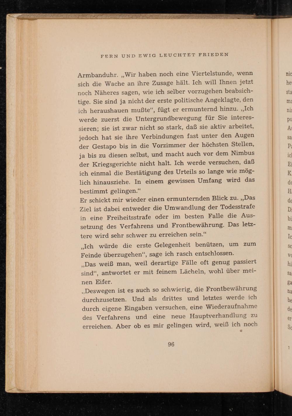 Er schickt mir wieder einen ermunternden Blick zu. ,, Das Ziel ist dabei entweder die Umwandlung der Todesstrafe in eine Freiheitsstrafe oder im besten Falle die Aussetzung des Verfahrens und Frontbewährung. Das letztere wird sehr schwer zu erreichen sein."