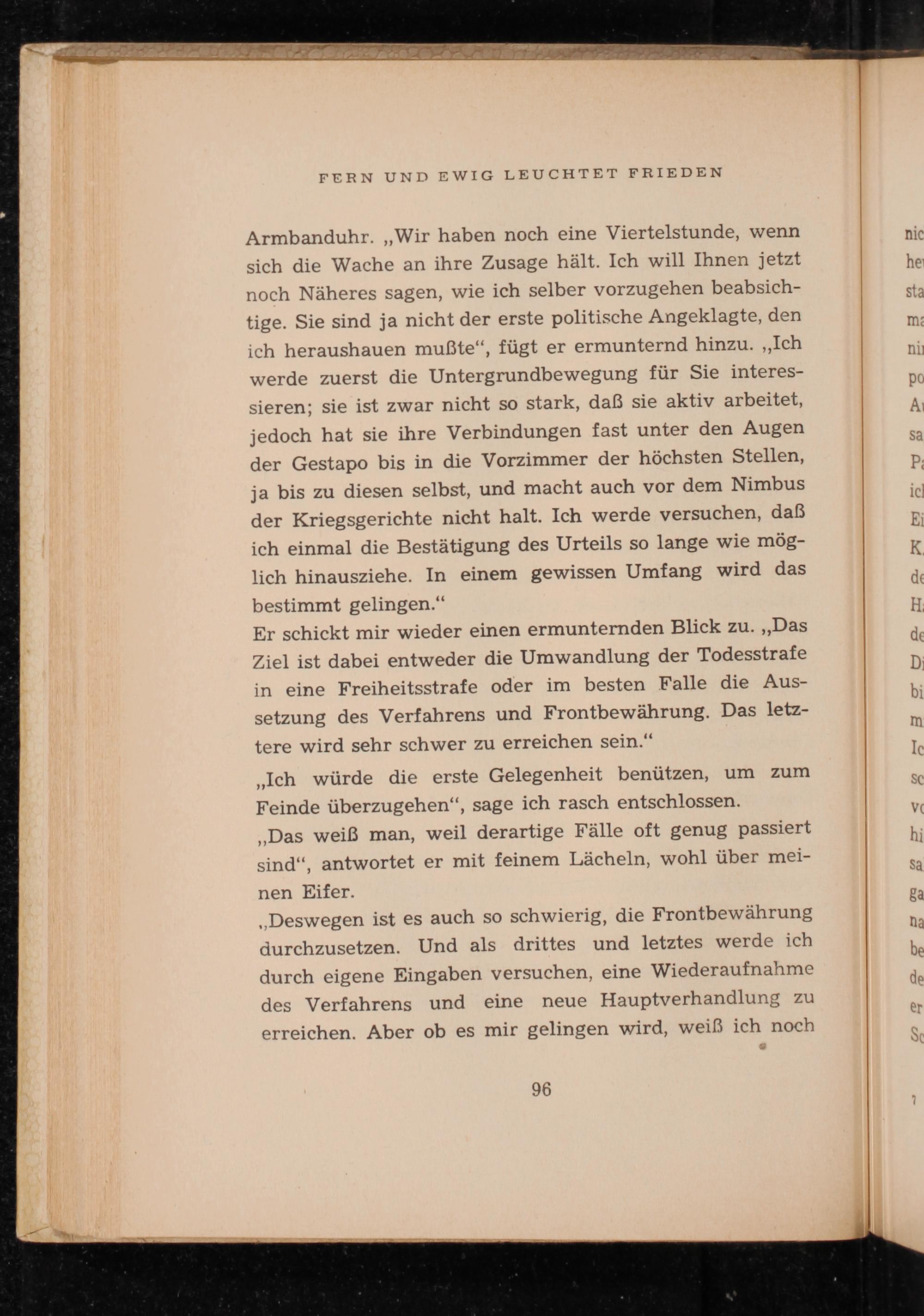 Armbanduhr. ,, Wir haben noch eine Viertelstunde, wenn sich die Wache an ihre Zusage hält. Ich will Ihnen jetzt noch Näheres sagen, wie ich selber vorzugehen beabsichtige. Sie sind ja nicht der erste politische Angeklagte, den ich heraushauen mußte", fügt er ermunternd hinzu. ,, Ich werde zuerst die Untergrundbewegung für Sie interessieren; sie ist zwar nicht so stark, daß sie aktiv arbeitet, jedoch hat sie ihre Verbindungen fast unter den Augen der Gestapo bis in die Vorzimmer der höchsten Stellen, ja bis zu diesen selbst, und macht auch vor dem Nimbus der Kriegsgerichte nicht halt. Ich werde versuchen, daß ich einmal die Bestätigung des Urteils so lange wie möglich hinausziehe. In einem gewissen Umfang wird das bestimmt gelingen."