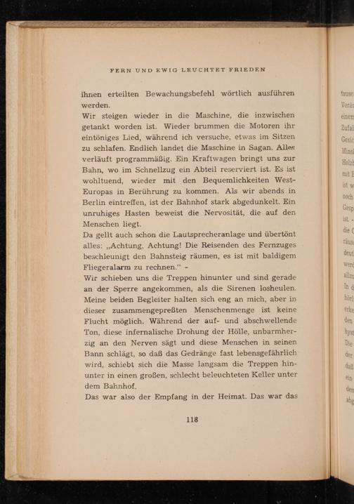 Wir steigen wieder in die Maschine, die inzwischen getankt worden ist. Wieder brummen die Motoren ihr eintöniges Lied, während ich versuche, etwas im Sitzen zu schlafen. Endlich landet die Maschine in Sagan. Alles verläuft programmäßig. Ein Kraftwagen bringt uns zur Bahn, wo im Schnellzug ein Abteil reserviert ist. Es ist wohltuend, wieder mit den Bequemlichkeiten WestEuropas in Berührung zu kommen. Als wir abends in Berlin eintreffen, ist der Bahnhof stark abgedunkelt. Ein unruhiges Hasten beweist die Nervosität, die auf den Menschen liegt.