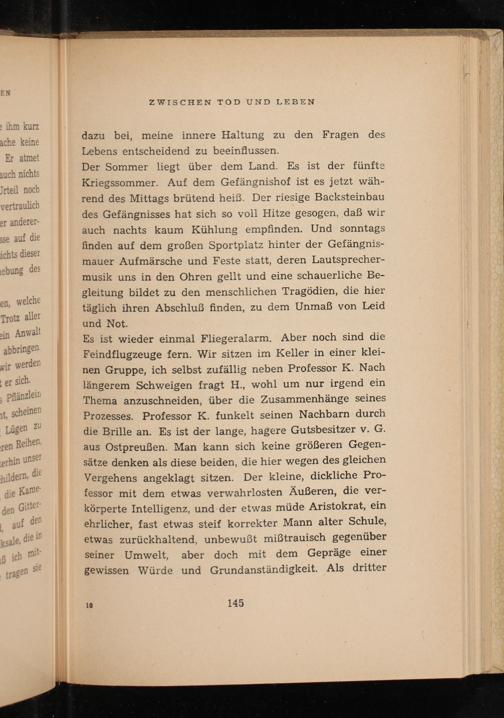 Es ist wieder einmal Fliegeralarm. Aber noch sind die Feindflugzeuge fern. Wir sitzen im Keller in einer kleinen Gruppe, ich selbst zufällig neben Professor K. Nach längerem Schweigen fragt H., wohl um nur irgend ein Thema anzuschneiden, über die Zusammenhänge seines Prozesses. Professor K. funkelt seinen Nachbarn durch die Brille an. Es ist der lange, hagere Gutsbesitzer v. G. aus Ostpreußen . Man kann sich keine größeren Gegensätze denken als diese beiden, die hier wegen des gleichen Vergehens angeklagt sitzen. Der kleine, dickliche Professor mit dem etwas verwahrlosten Äußeren, die verkörperte Intelligenz, und der etwas müde Aristokrat, ein ehrlicher, fast etwas steif korrekter Mann alter Schule, etwas zurückhaltend, unbewußt mißtrauisch gegenüber seiner Umwelt, aber doch mit dem Gepräge einer gewissen Würde und Grundanständigkeit. Als dritter