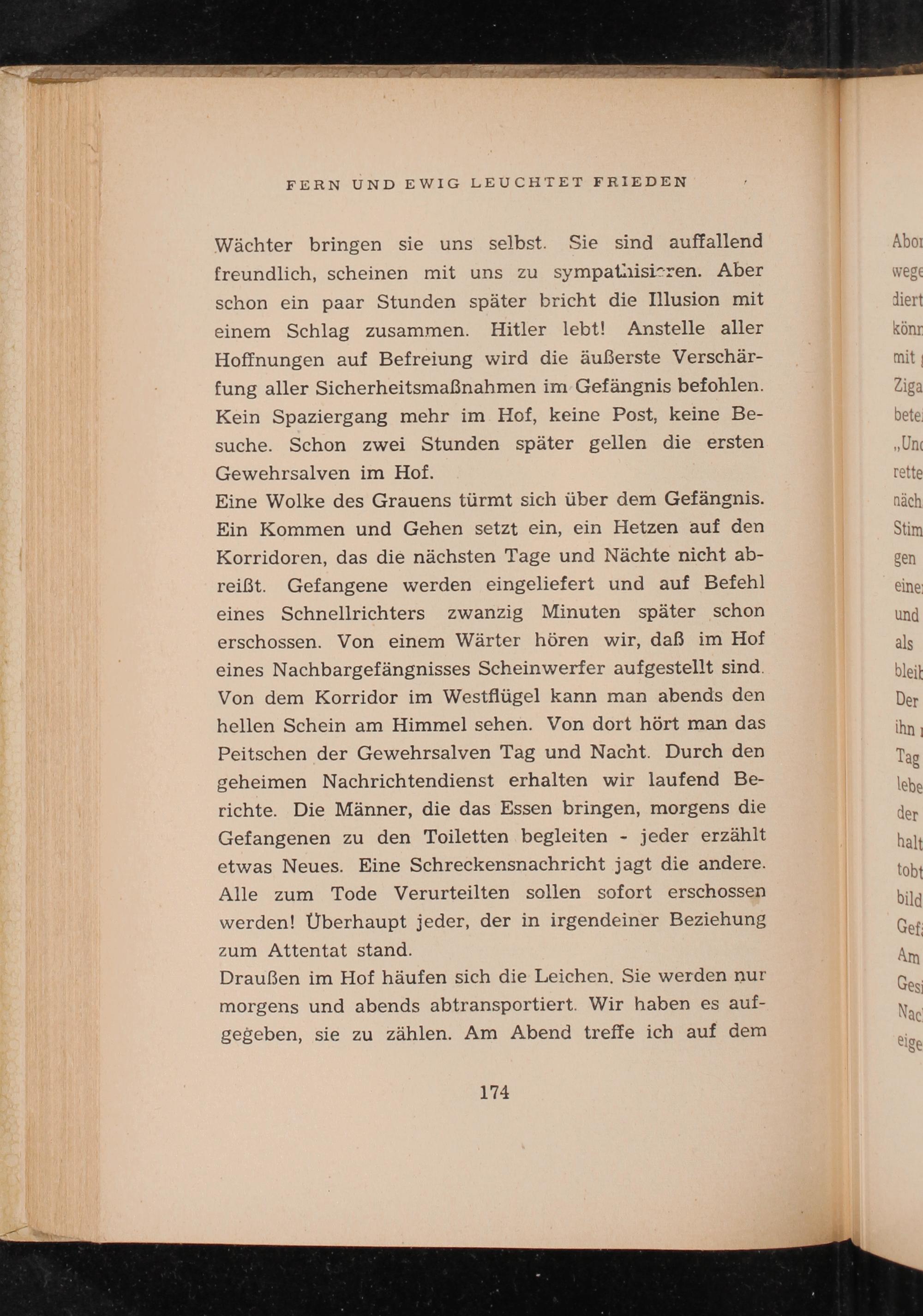 Wächter bringen sie uns selbst. Sie sind auffallend freundlich, scheinen mit uns zu sympathisieren. Aber schon ein paar Stunden später bricht die Illusion mit einem Schlag zusammen. Hitler lebt! Anstelle aller Hoffnungen auf Befreiung wird die äußerste Verschärfung aller Sicherheitsmaßnahmen im Gefängnis befohlen. Kein Spaziergang mehr im Hof, keine Post, keine Besuche. Schon zwei Stunden später gellen die ersten Gewehrsalven im Hof.