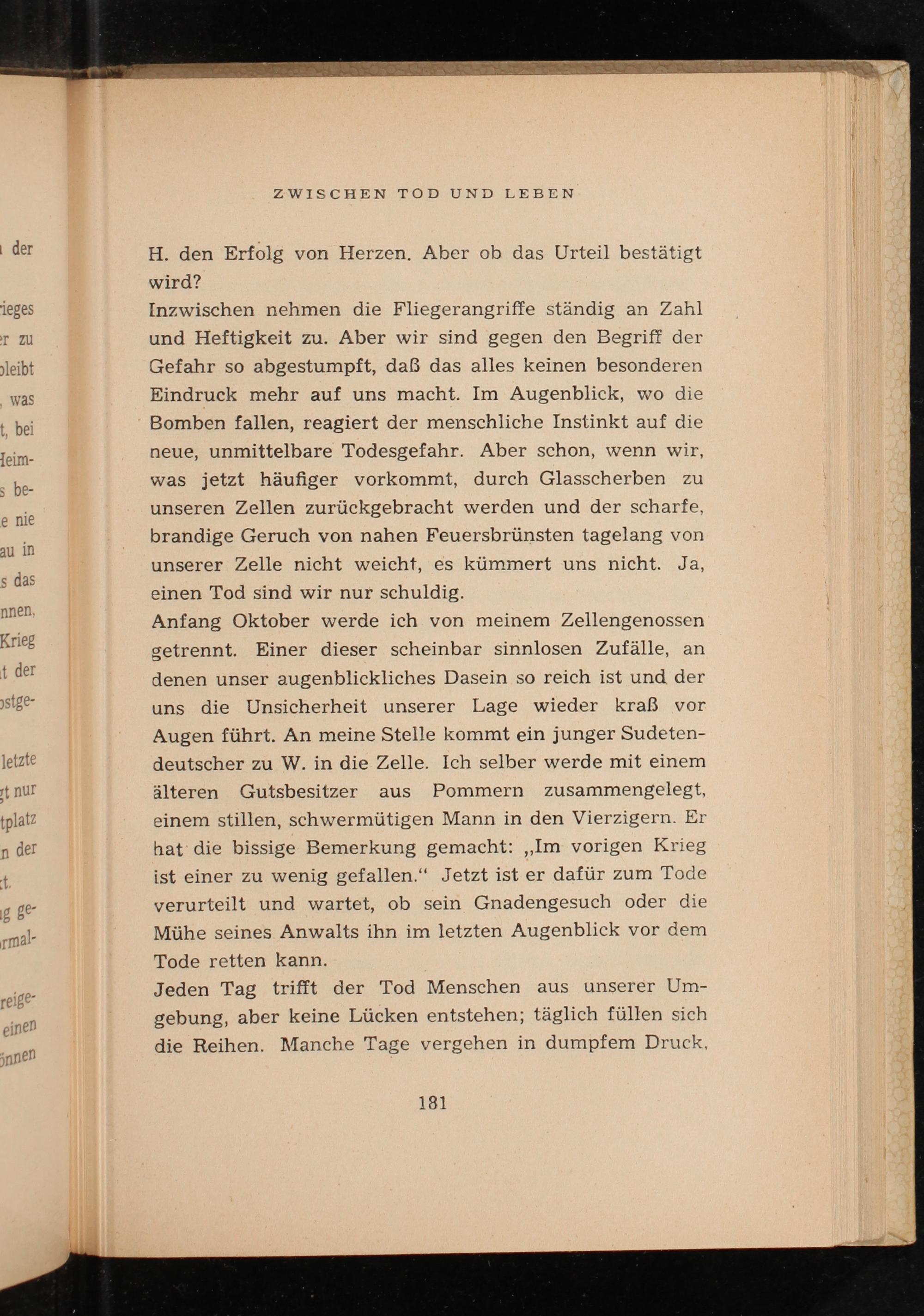 Inzwischen nehmen die Fliegerangriffe ständig an Zahl und Heftigkeit zu. Aber wir sind gegen den Begriff der Gefahr so abgestumpft, daß das alles keinen besonderen Eindruck mehr auf uns macht. Im Augenblick, wo die Bomben fallen, reagiert der menschliche Instinkt auf die neue, unmittelbare Todesgefahr. Aber schon, wenn wir, was jetzt häufiger vorkommt, durch Glasscherben zu unseren Zellen zurückgebracht werden und der scharfe, brandige Geruch von nahen Feuersbrünsten tagelang von unserer Zelle nicht weicht, es kümmert uns nicht. Ja, einen Tod sind wir nur schuldig.