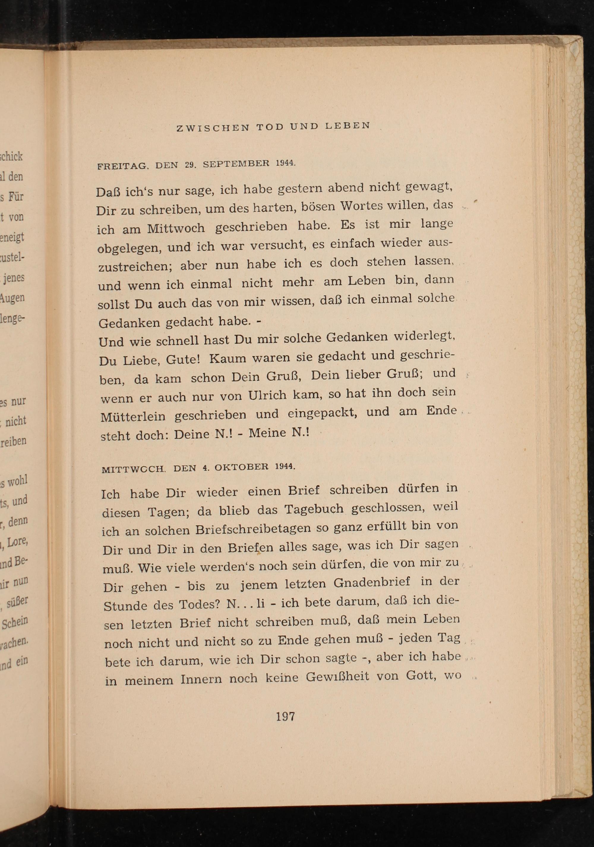 Ich habe Dir wieder einen Brief schreiben dürfen in diesen Tagen; da blieb das Tagebuch geschlossen, weil ich an solchen Briefschreibetagen so ganz erfüllt bin von Dir und Dir in den Briefen alles sage, was ich Dir sagen muß. Wie viele werden's noch sein dürfen, die von mir zu Dir gehen- bis zu jenem letzten Gnadenbrief in der Stunde des Todes? N... li- ich bete darum, daß ich diesen letzten Brief nicht schreiben muß, daß mein Leben noch nicht und nicht so zu Ende gehen muß jeden Tag bete ich darum, wie ich Dir schon sagte-, aber ich habe... in meinem Innern noch keine Gewißheit von Gott, wo